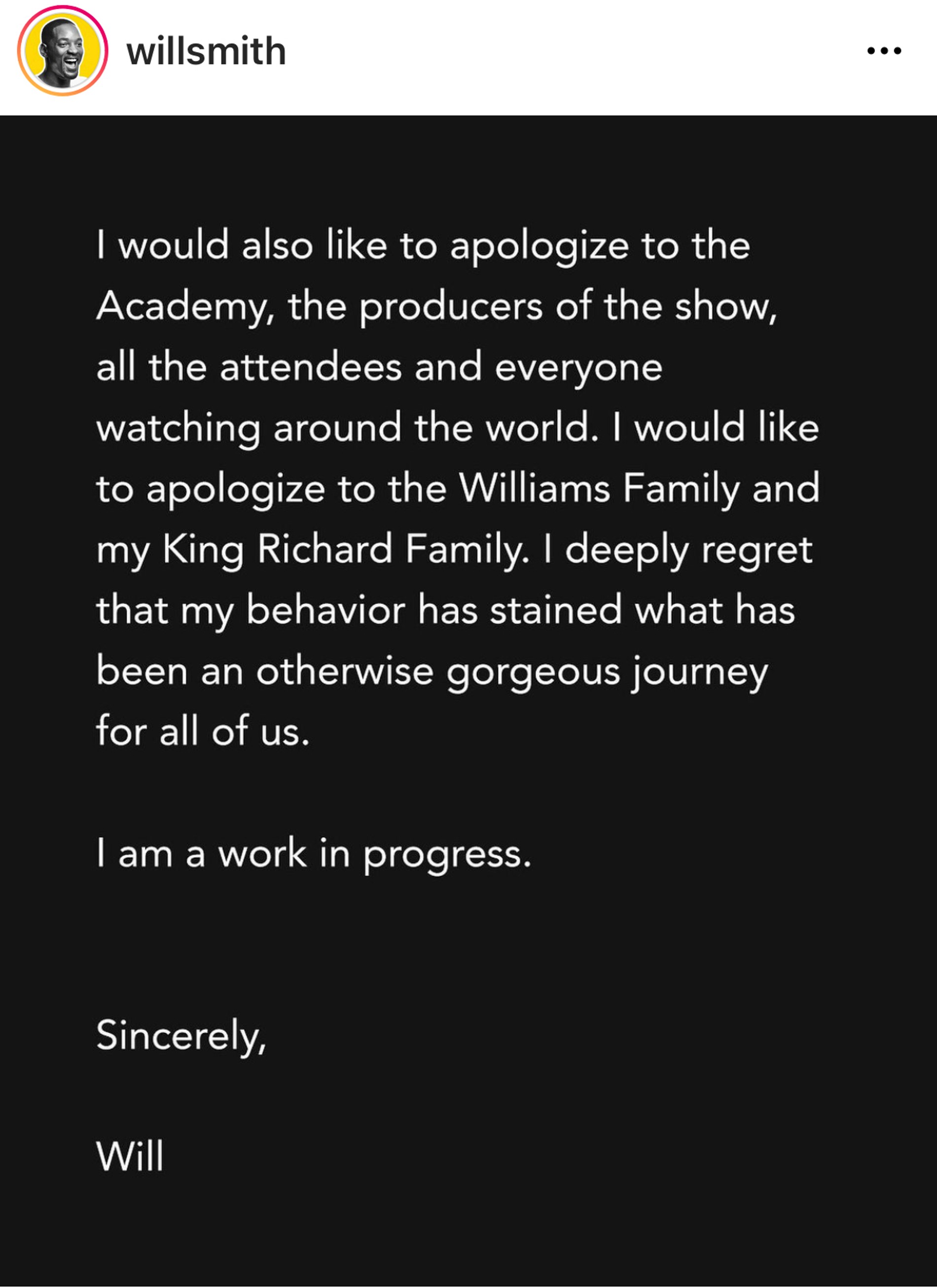 Обладатель премии «Оскар» принес извинения не только комику, но еще и Академии киноискусств, семье Уильямс и съемочной группе фильма «Король Ричард». Он считает, что его поведение запятнало то, что «в остальном было великолепным путешествием» для всей команды. Уилл уточнил, что он все еще продолжает работать над собой.