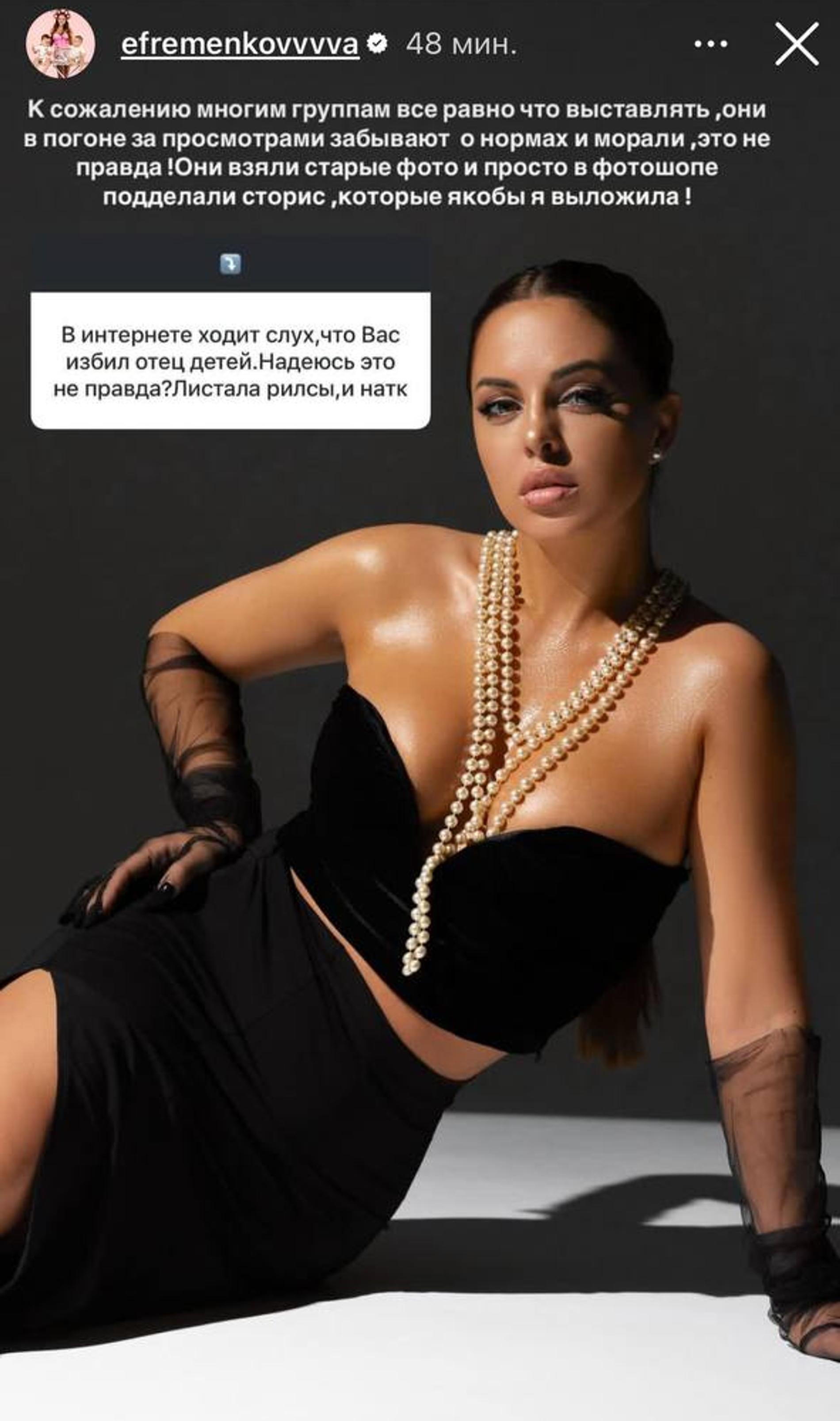 «К сожалению, многим группам все равно что выставлять. Они в погоне за просмотрами забывают о нормах и морали, это неправда! Они взяли старые фото и просто в фотошопе подделали сторис, которые якобы я выложила», — рассказала Ефременкова в сторис.