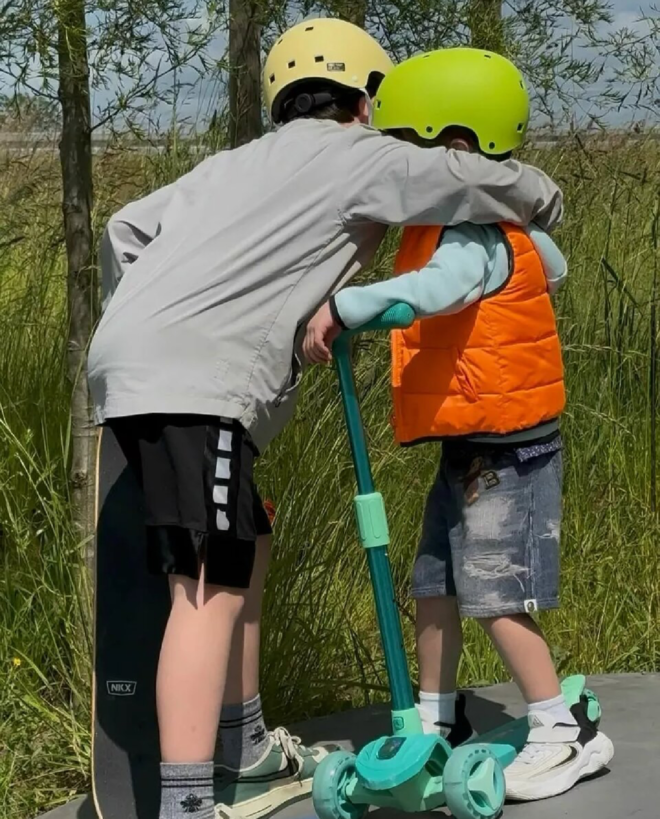 Летний досуг мальчиков запечатлён на снимках: старший сын катается на скейтборде, а младший — на ярком зелёном самокате. Под фото актриса оставила милую подпись: «Семейное летнее настроение».