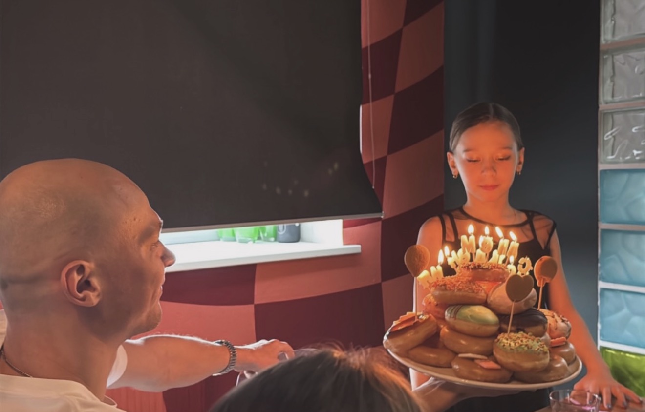 На снимке 9-летняя Акулина держит праздничный торт с зажжёнными свечами и, следуя традиции, загадывает желание с закрытыми глазами. Рядом с ней сидит счастливый Юра Борисов, который с нежностью и умилением смотрит на свою дочь.