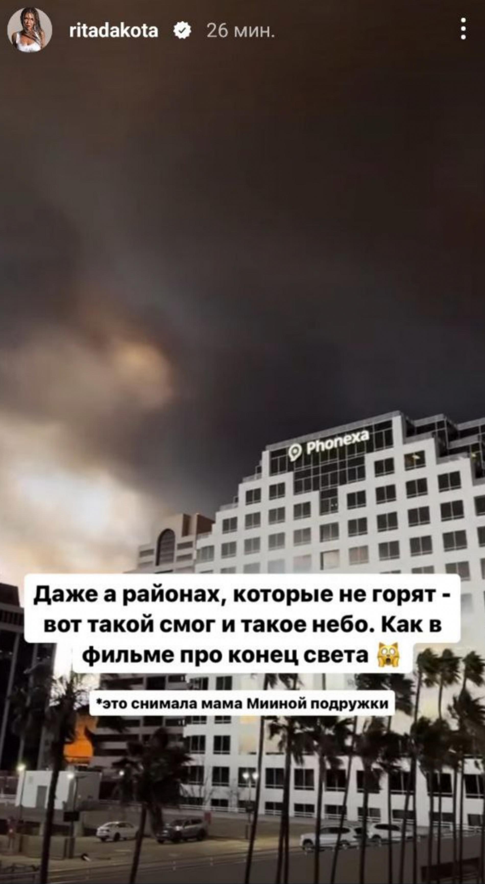 Рита выложила апокалиптичные кадры, которые сняли ее знакомые, оставшиеся в Лос-Анджелесе. На одном из снимков пламя буквально под окнами дома, в котором живет Дакота с мужем и дочерью.