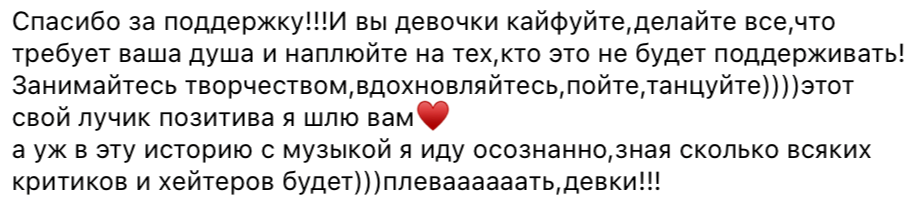 Ира поспешила успокоить публику, заявив, что строить музыкальную карьеру она не планирует, а также поблагодарила поклонников за поддержку.
