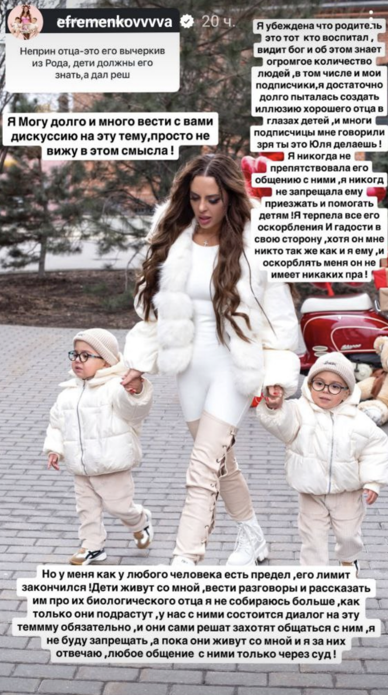 После некоторого затишья и по просьбе подписчиков Юлия накануне вновь высказалась на эту тему. Как выяснилось, Мондезир всё так же не видится с детьми и позиция Юлии осталась прежней. Более того, экс-участница скандального реалити даже не допускает, что в обозримом будущем позволит бывшему увидеть детей. «Дети живут со мной. Рассказывать им про их биологического отца я не собираюсь больше. Когда они подрастут, у нас с ними состоится разговор, и тогда они сами решат, захотят ли с ним общаться. А пока они живут со мной и я за них отвечаю, любое общение с ним только через суд», — заявила Ефременкова.
