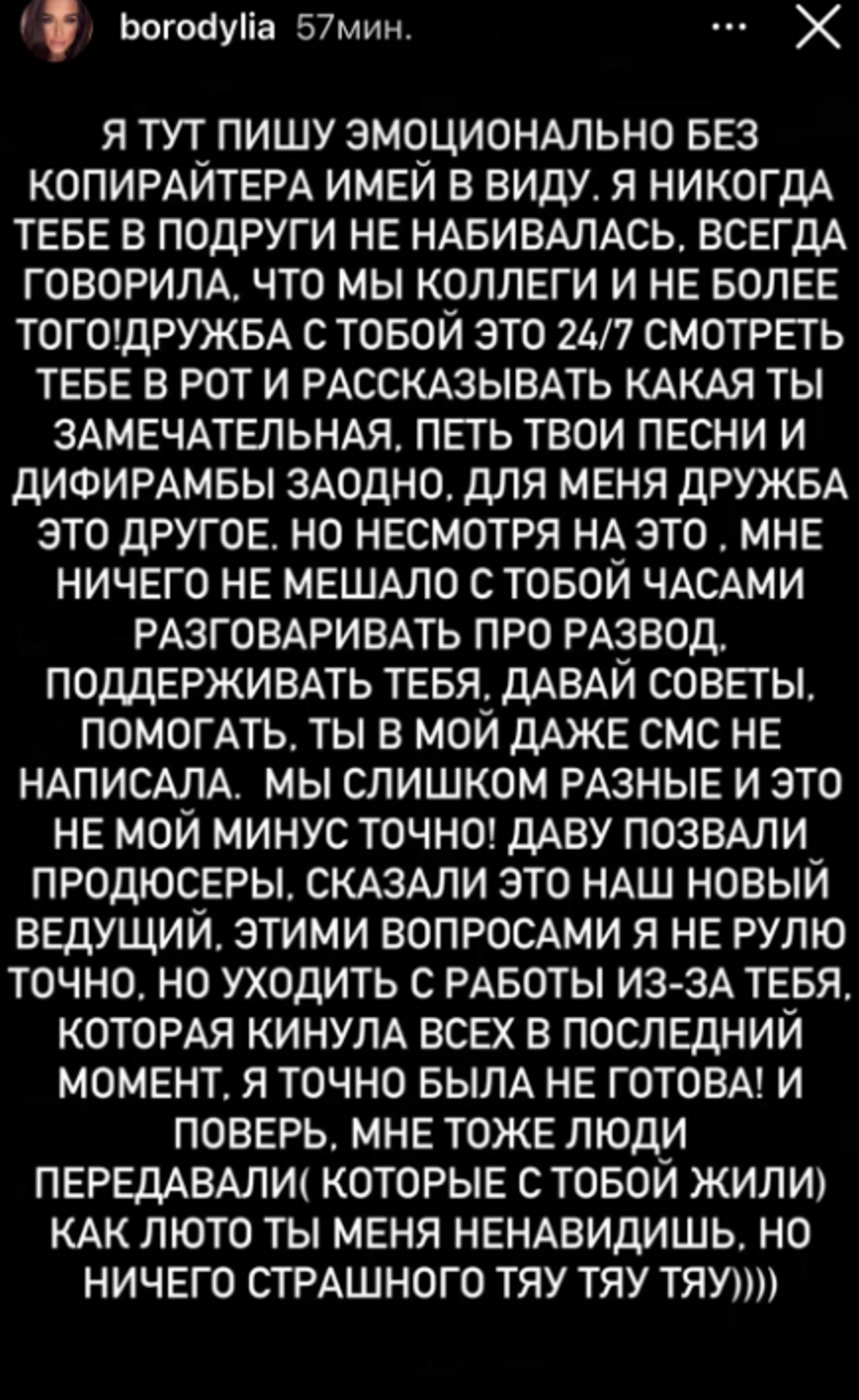 Ксения молчать не стала и опубликовала ответные сторис, обвинив Бузову в сговоре с начальством: «Сама за моей спиной побежала к генеральным и договорилась, что кинешь «Дом-2» ради другой программы». Опровергла Бородина и заявления Ольги, касающиеся ситуации с ее бывшим мужем. В конце своего обращения она написала, что никогда не набивалась в подруги, ведь «дружить с Бузовой — это 24 часа в сутки рассказывать, какая она замечательная».
