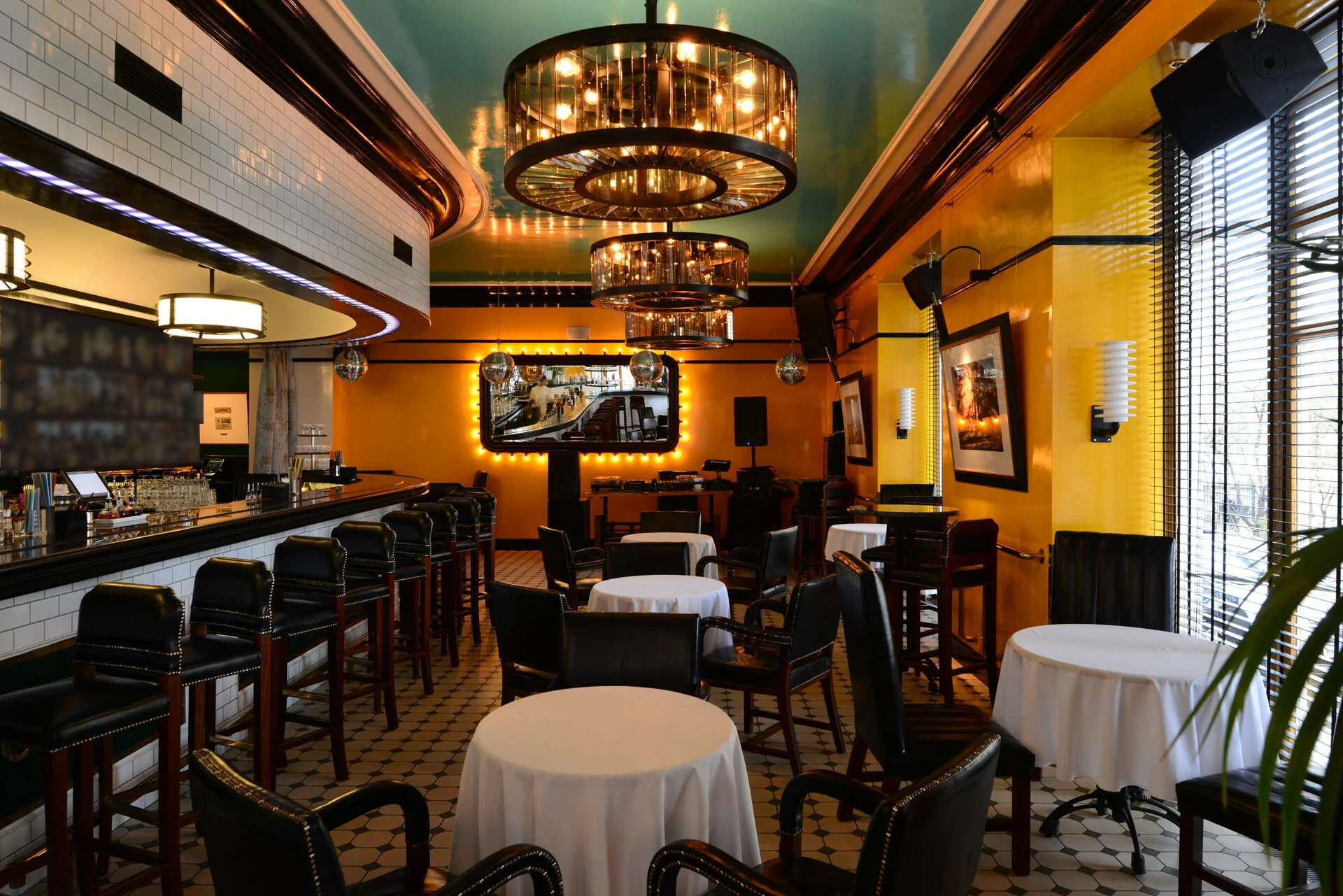 Жёлтые стены, бирюзовый потолок, на полу — белая плитка с чёрными вставками. Керамика (но уже другого формата) украшает барную стойку и зону лестницы. Также в качестве декора — зеркала и латунь. В общем, чикагский арт-деко во всей красе. Одни приходят сюда на ужин перед тем, как отправиться в близлежащий театр. Другие заглядывают после спектакля, чтобы продолжить вечер танцами. А третьи ждут здешних выставок.