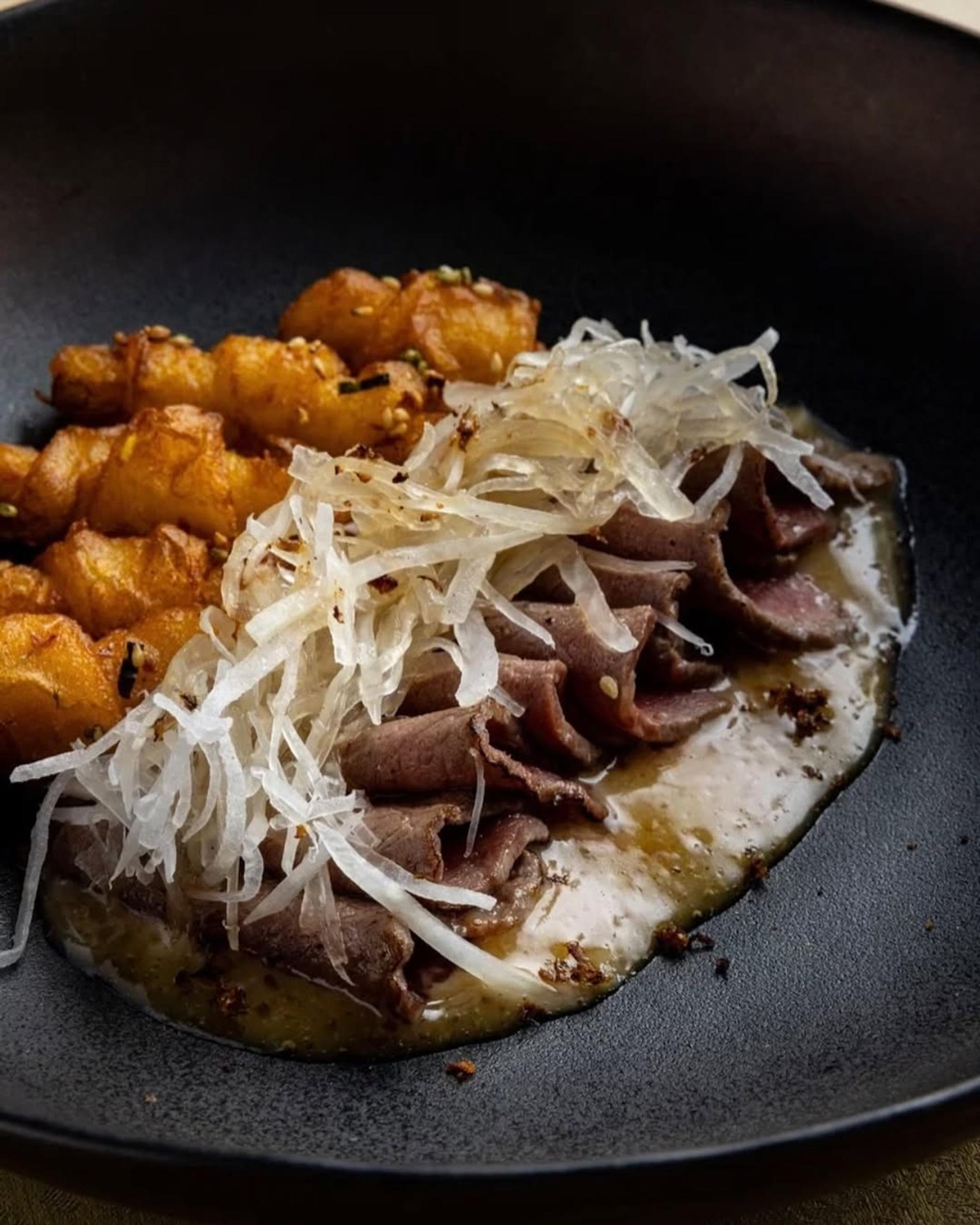 Картофельным хлебом уже никого не удивишь, а потому совсем неудивительно, что на этой же основе выпекаются и круассаны, которые постоянно вдохновляют кулинаров на творчество (плоские и кубические круассаны мы уже пережили). И поскольку лучший дуэт у картошки получается с мясом, то почему бы к элегантным круассанам не подать не менее элегантный татаки из говядины с соусом бонито.