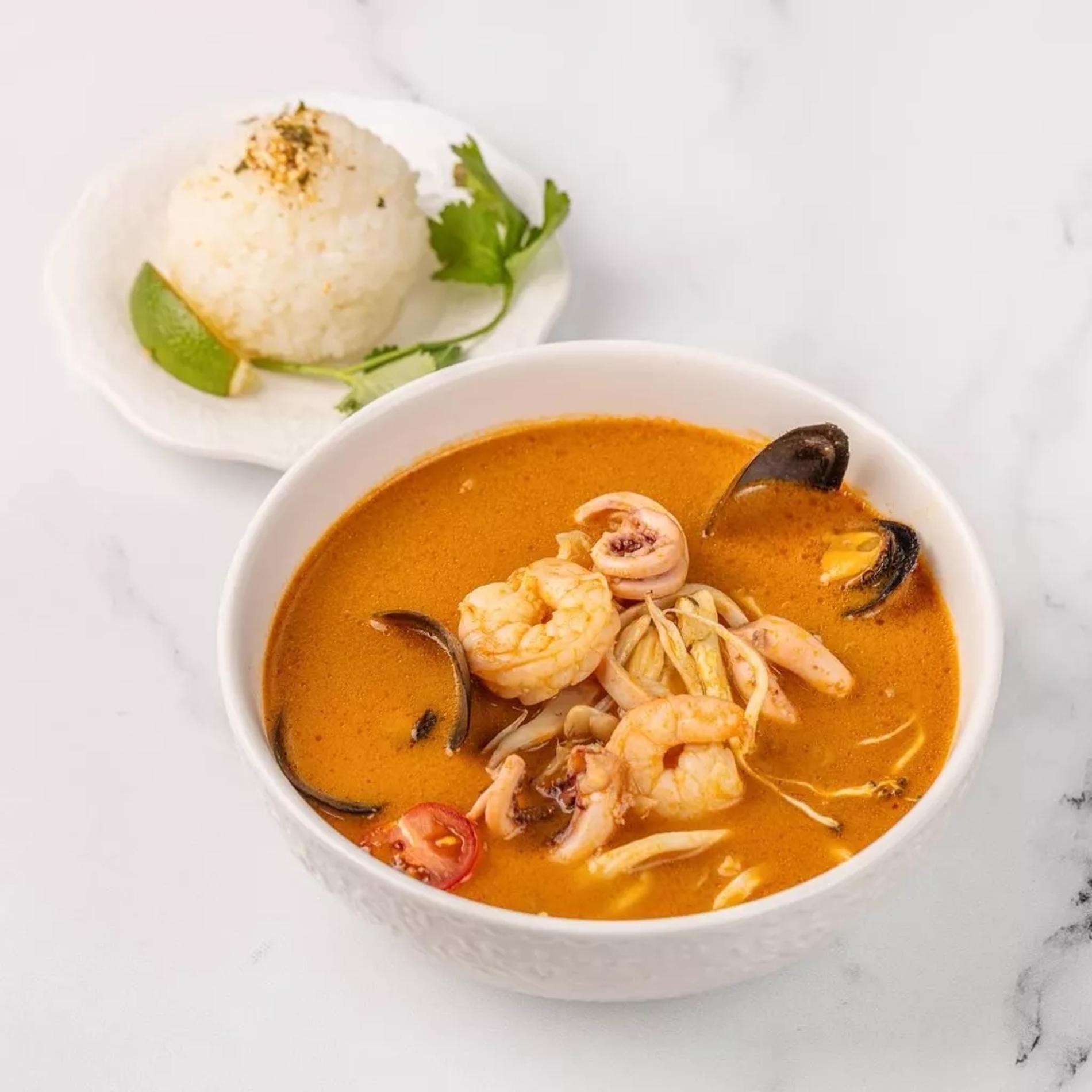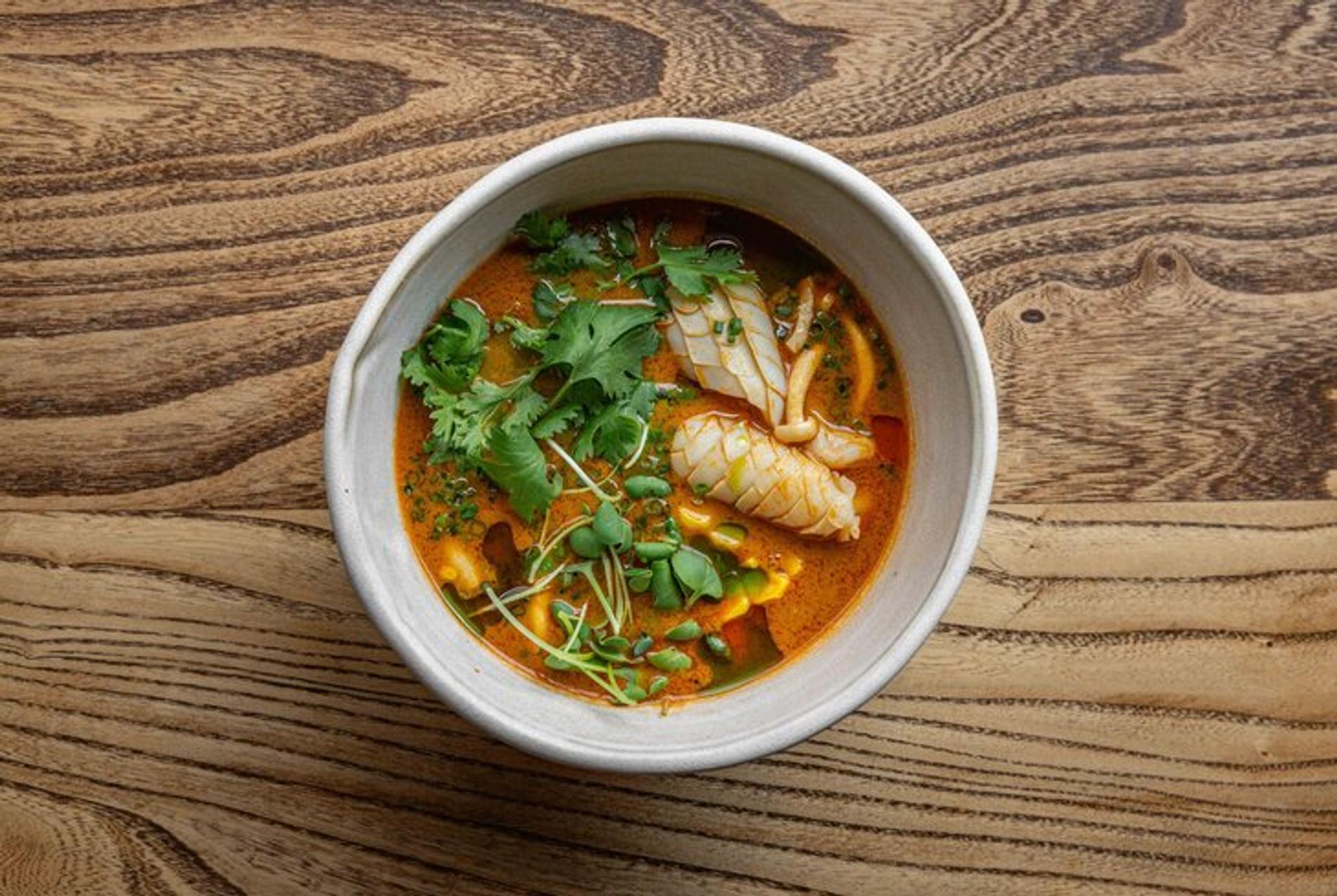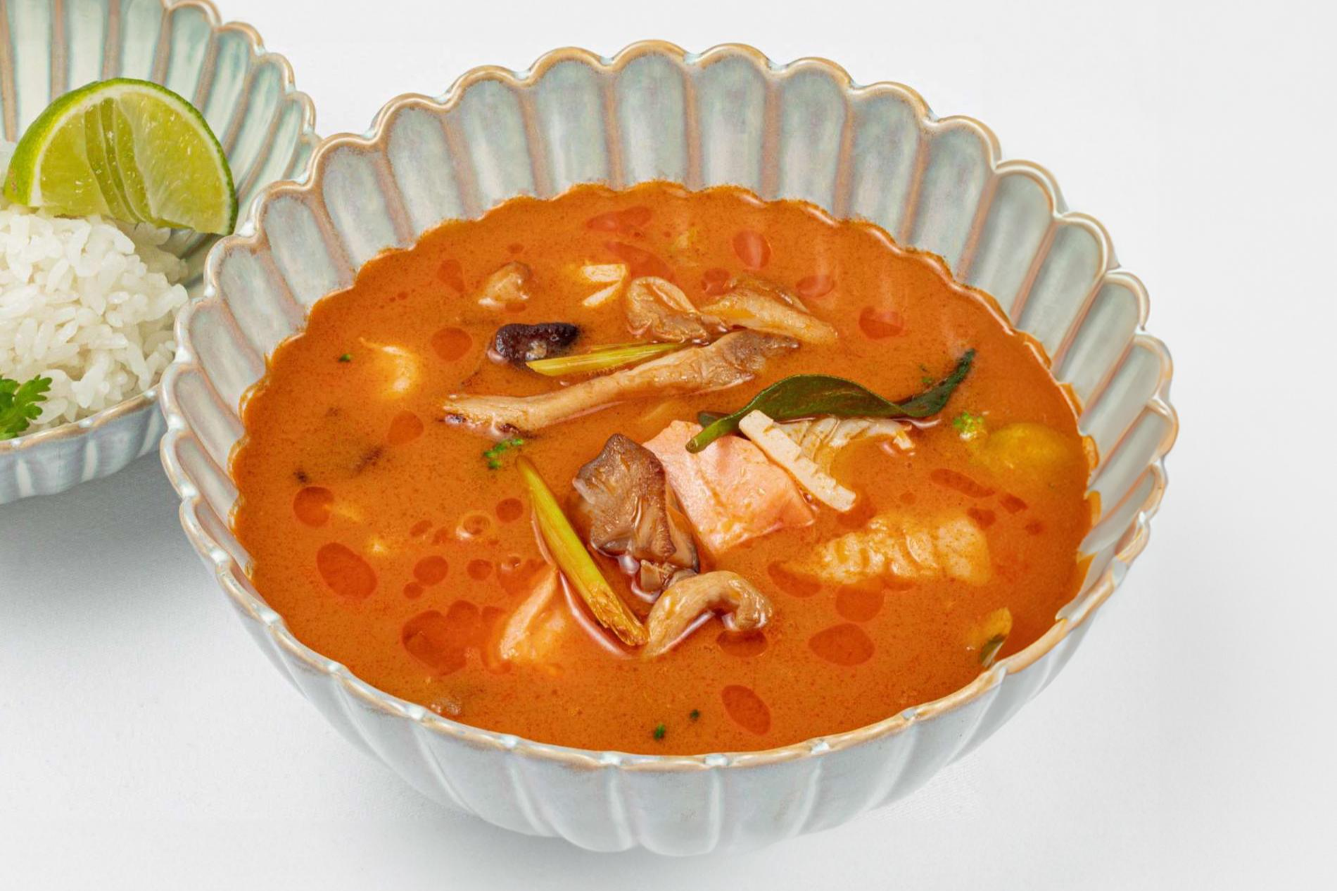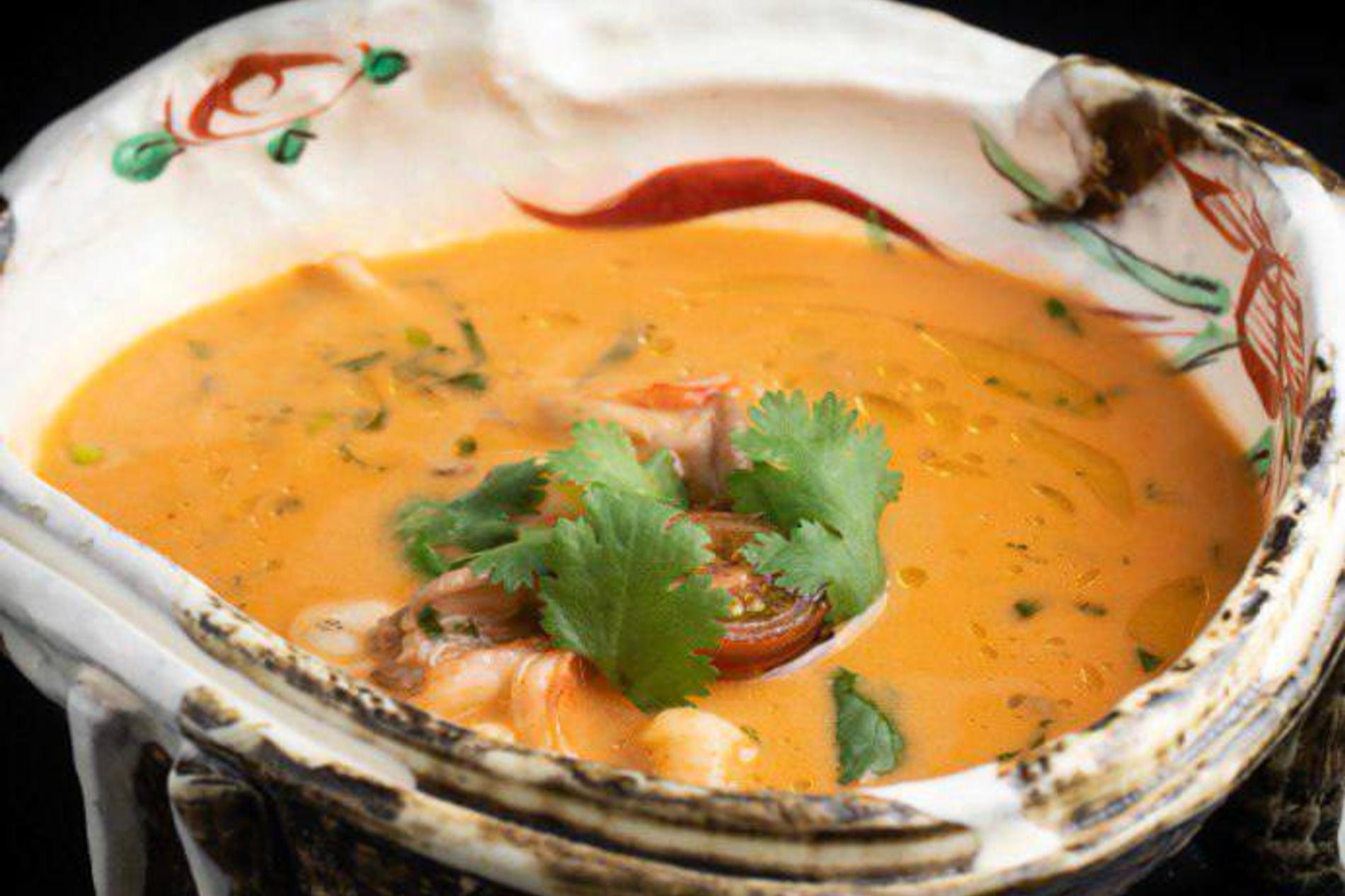 Как бы мы ни любили том‑ям за его ароматные кокосовые ноты, но оригинальный суп готовился всё же без кокосового молока, и бульон оставался прозрачным. В середине XIX века блюдо обосновалось на столе короля, и только тогда рецептура изменилась. Ещё один апдейт — в виде добавления креветок — произошёл в 1930‑е. Такую классику мы любим; главное — усилить вкус кокосовыми сливками, лемонграссом, чили и лаймом.