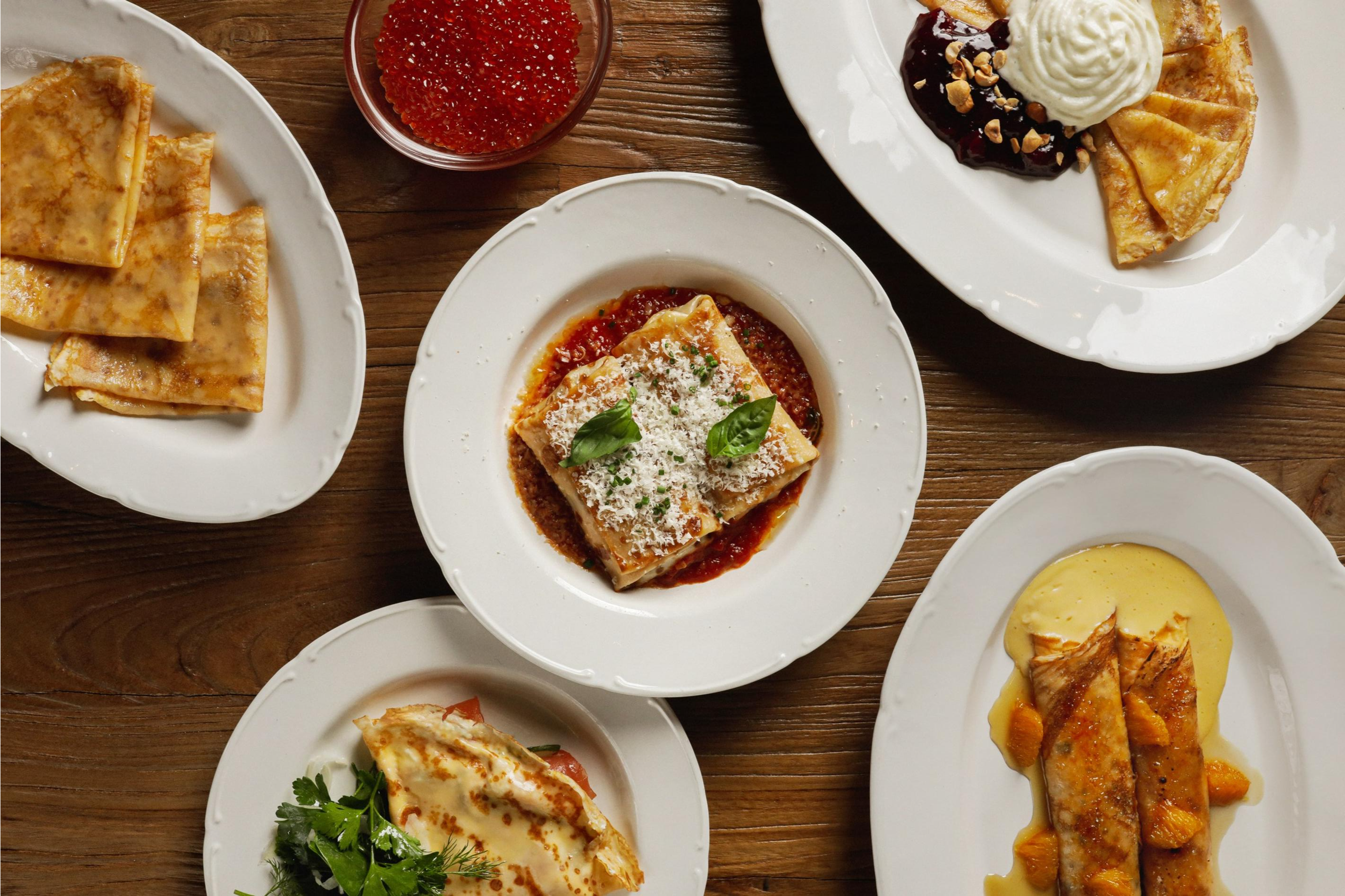 Привычные топпинги, среди которых сметана, икра форели, сгущённое молоко, ягоды, только на первый взгляд выглядят скучно. Во-первых, всё это можно красиво сервировать, а во-вторых, почему бы не предаться ностальгии по детству, когда главное было не начинка, а блины — самые лучшие, бабушкины. И только потом можно усложнить себе жизнь, попробовав более фантазийные варианты вроде болоньезе, лосося с икорным соусом или макового крема с лимонным курдом и меренгой.
