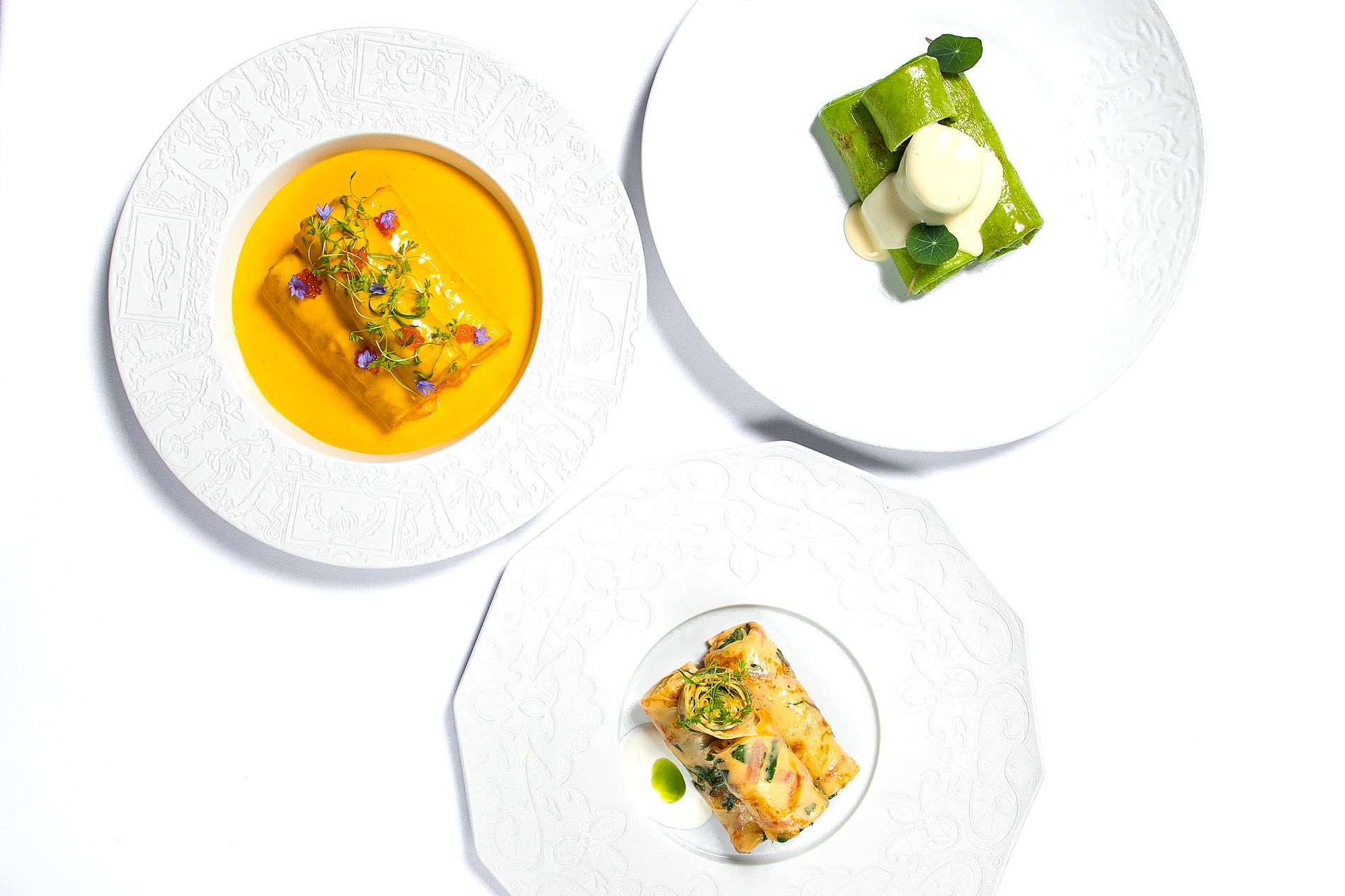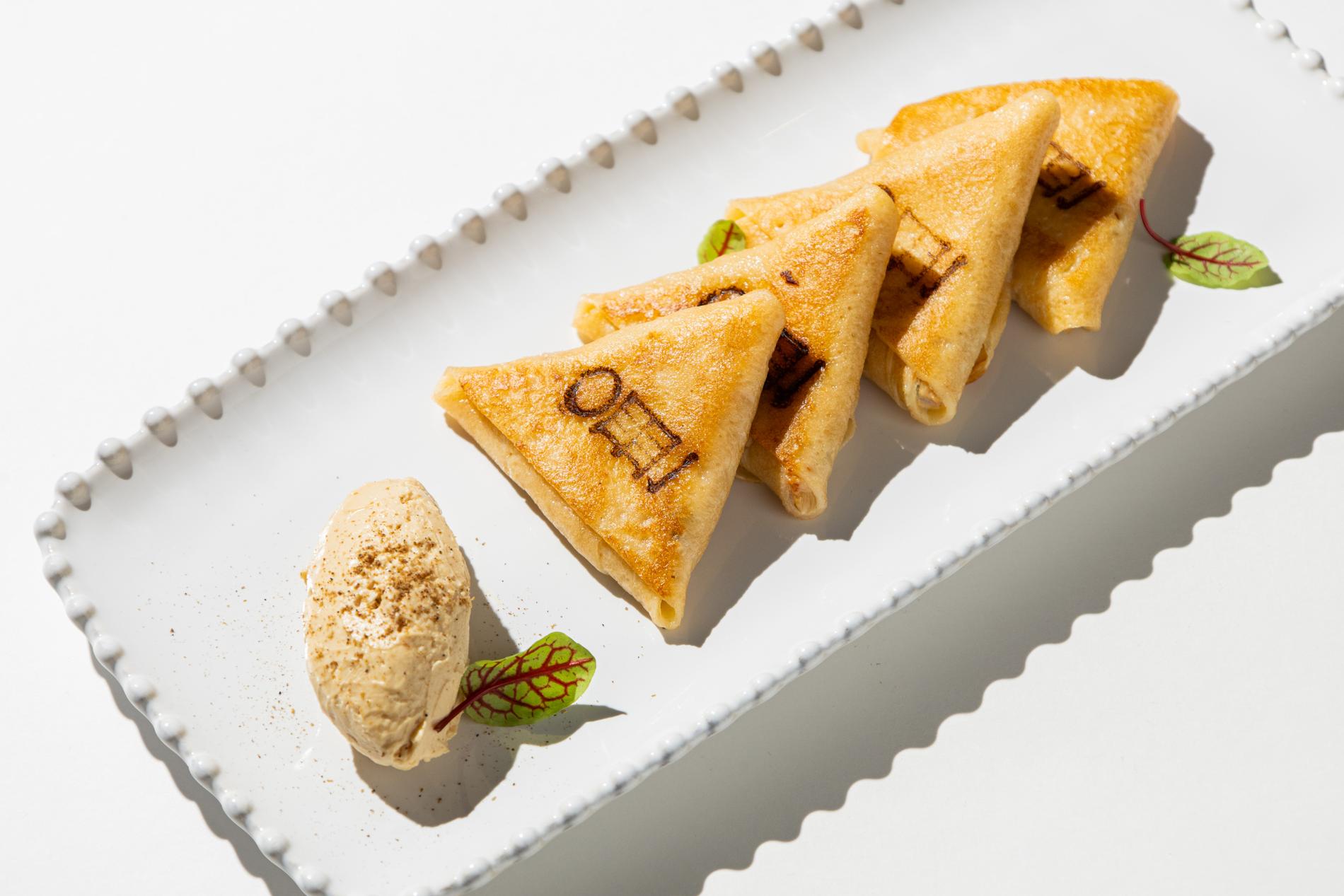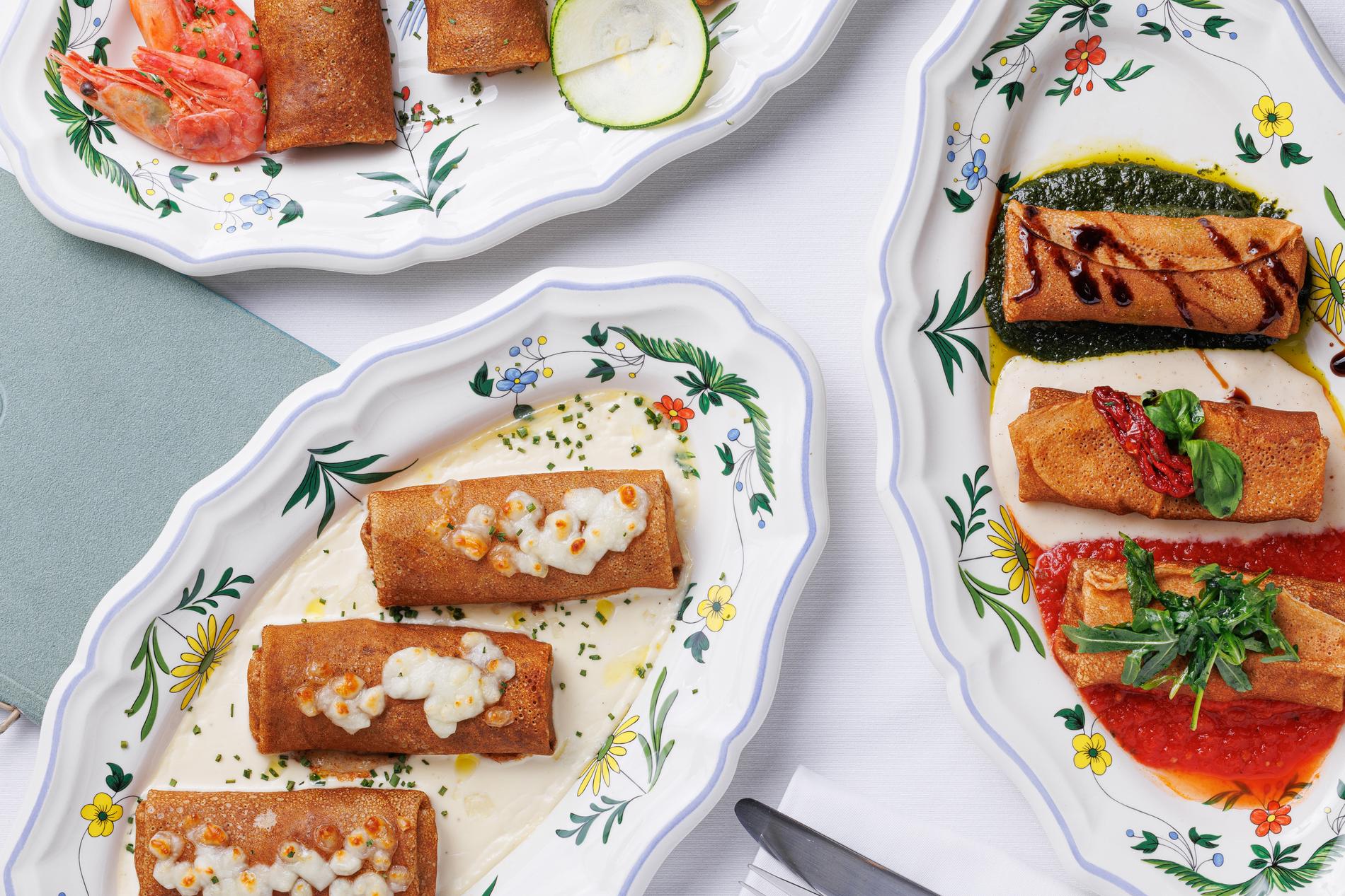 Говорят, блины придумали итальянцы, назвали их «креспэлле» и приноровились заворачивать в них всевозможные начинки, несмотря на то что они меньше наших по размеру. Итак, в конвертиках «болоньезе» скрывается мясной фарш с карамелизированным луком, моцареллой и соусом жу. Треугольник идёт с малосольным лососем, творожным сыром, каперсами и маринованным огурцом. А трубочка начинена маскарпоне, а также полита кремом и карамелью с кусочками апельсина.