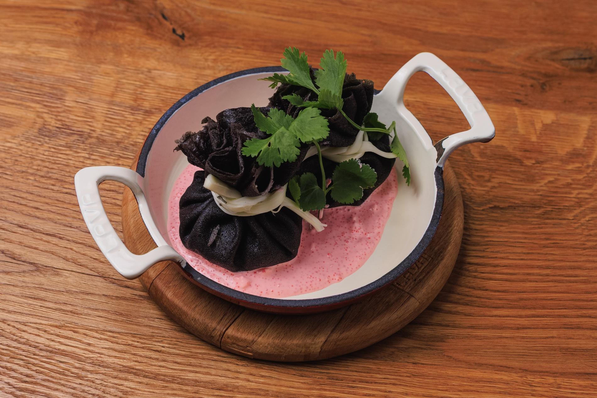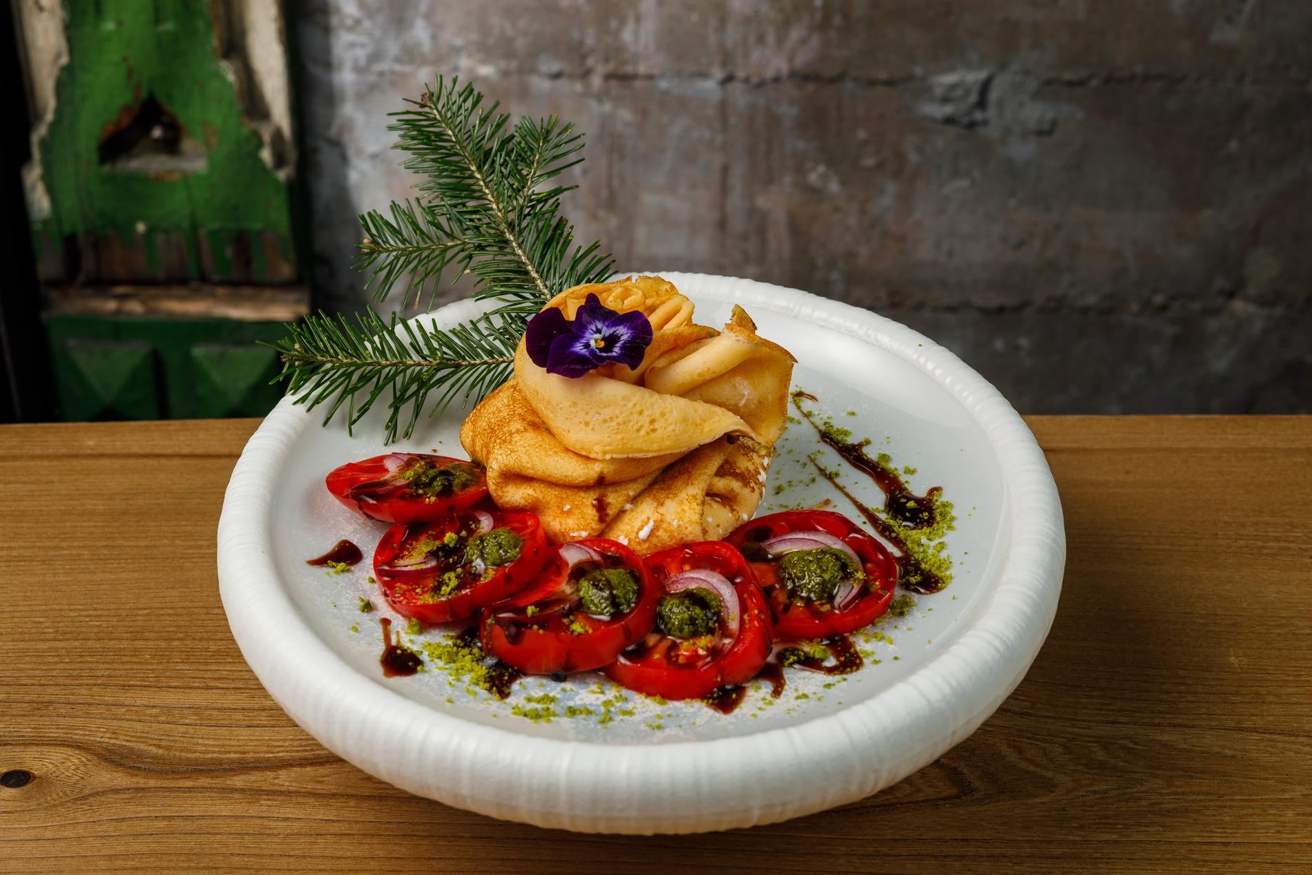 Масленица с грузинским акцентом — это, конечно же, в первую очередь хинкали. Естественно, не простые, а из блинов, причём чёрных. Внутри — микс из гречки, рыбы и лука, снаружи — сливочный соус, сыр чечил и кинза. Та же зелень, так любимая грузинами, наблюдается и в блинных рулетиках с начинкой из курицы, помидоров и солёного огурца. Ещё одна традиционная приправа — сванская соль — вошла в состав блинных роллов с томлёной говядиной, помидорами и чили.