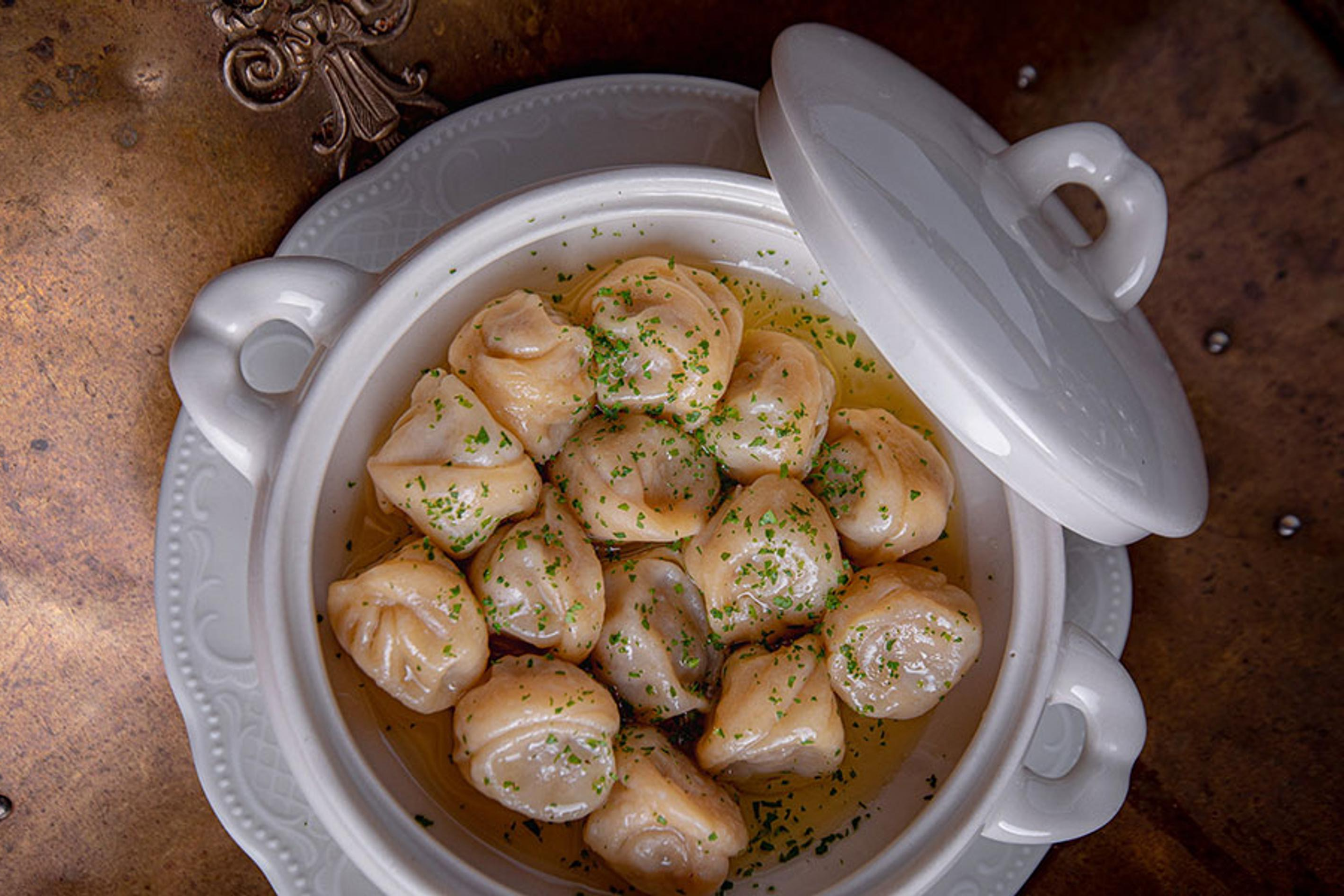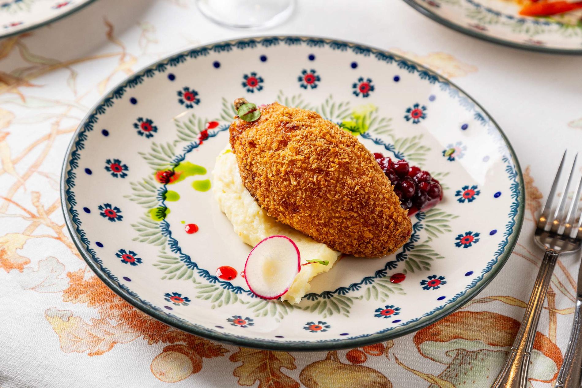 Деликатная адаптация гастротрадиций «пушкинской» эпохи на современный лад. Дух дворянской усадьбы здесь ощущается в каждом блюде — и в суточных щах из квашеной капусты, и в щучьей котлете по-мещански, и в бефстроганове с картофельным пюре. Пельмени, блинчики, пирожки — без этого никуда, как и без ответа на вопрос: «Галантинъ и голонтиръ — в чём разница?»