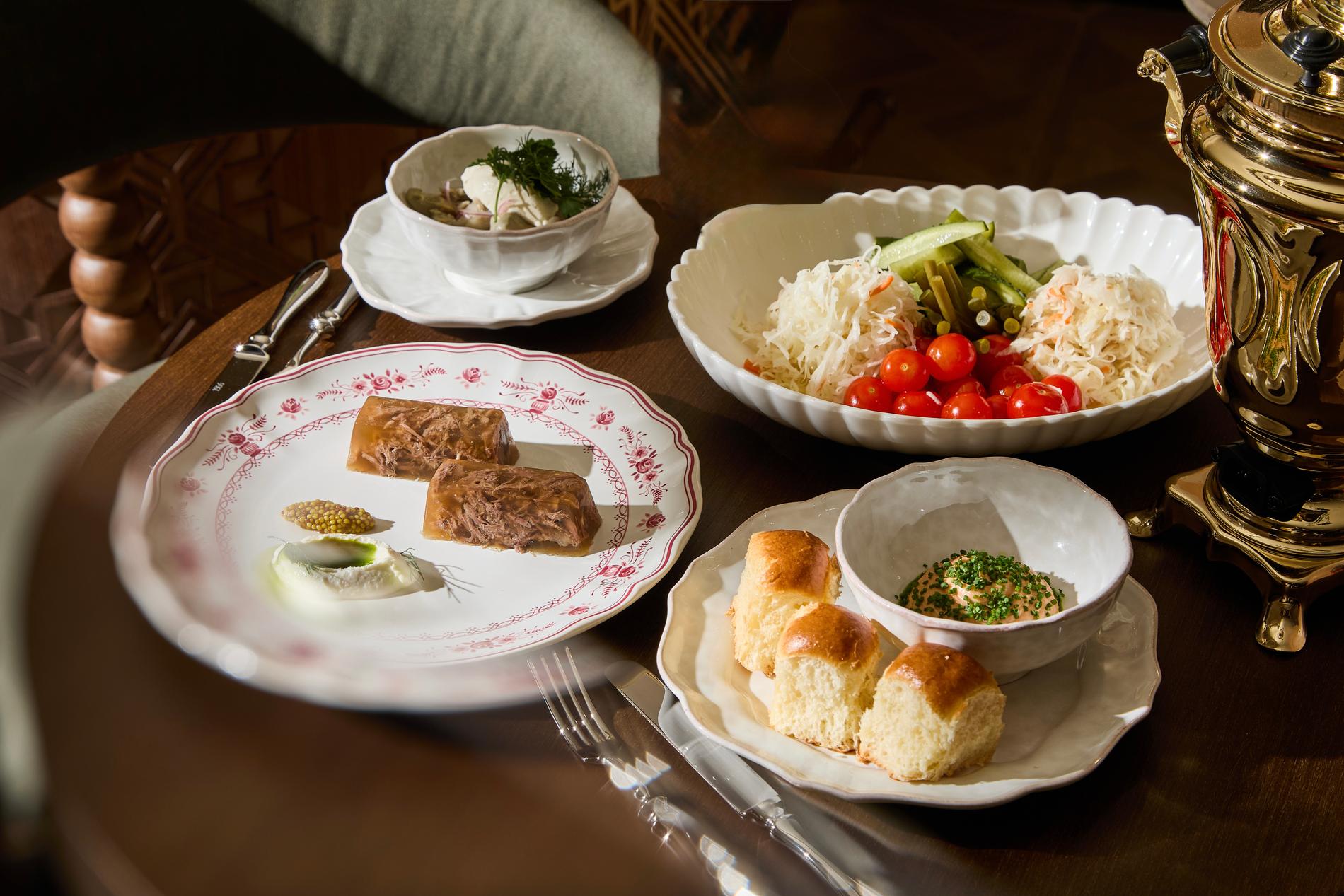 Русский народный стиль в концентрате: мезенская роспись, печь с изразцами, самовары с баранками, петушки на палочке. Тем временем стол превращается в скатерть-самобранку, на которой и холодец с яблочным хреном, и кулебяка рыбная, и винегрет с хамсой, и икра щучья с хрустящей перловкой. А ещё рваный гусь с пшённой кашей и треска с соусом из опят. Ну и десерт — «Матрёшка а ля рюс».