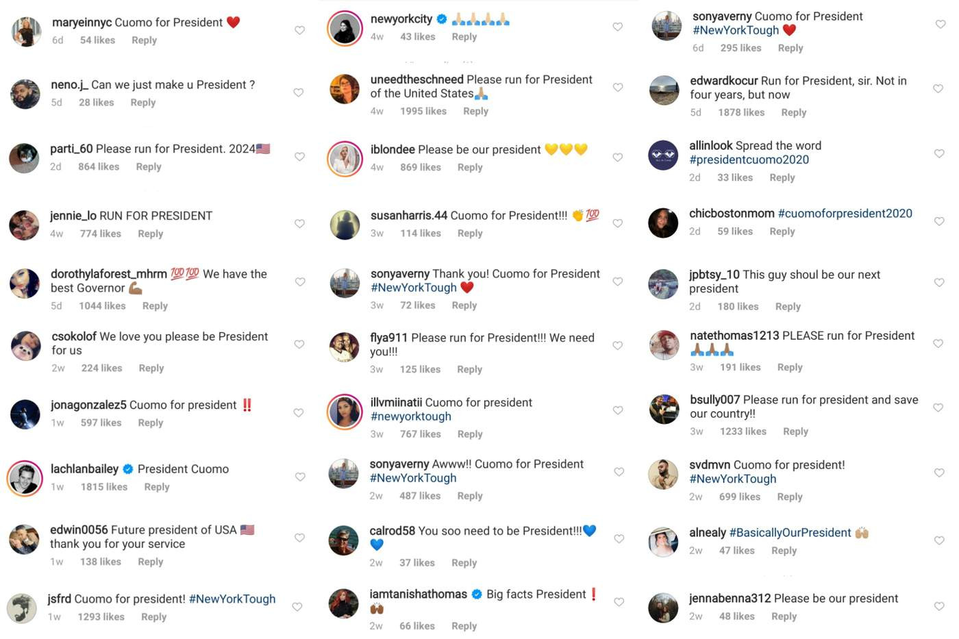 Этот год начался бодро и устроил миру внеплановый #icebucketchallenge, окатив ледяной водой в виде угрозы третьей мировой, природных катаклизмов и пандемии. Однако во всем негативе можно найти плюс: именно в такие трудные времена люди открываются с новой стороны и появляются лидеры, реанимирующие надежду на светлое будущее. Для жителей Нью-Йорка этим человеком стал губернатор Эндрю Куомо, рейтинги которого растут с каждым днем даже среди неодобрявших его республиканцев. Видеть больше Куомо захотели и жители других штатов, требующие, чтобы губернатор немедленно развернул президентскую кампанию. Серьезно, на новостных страницах и в Инстаграме самого политика комментарии «Куомо в президенты!» даже не нужно искать, они сами вас найдут: