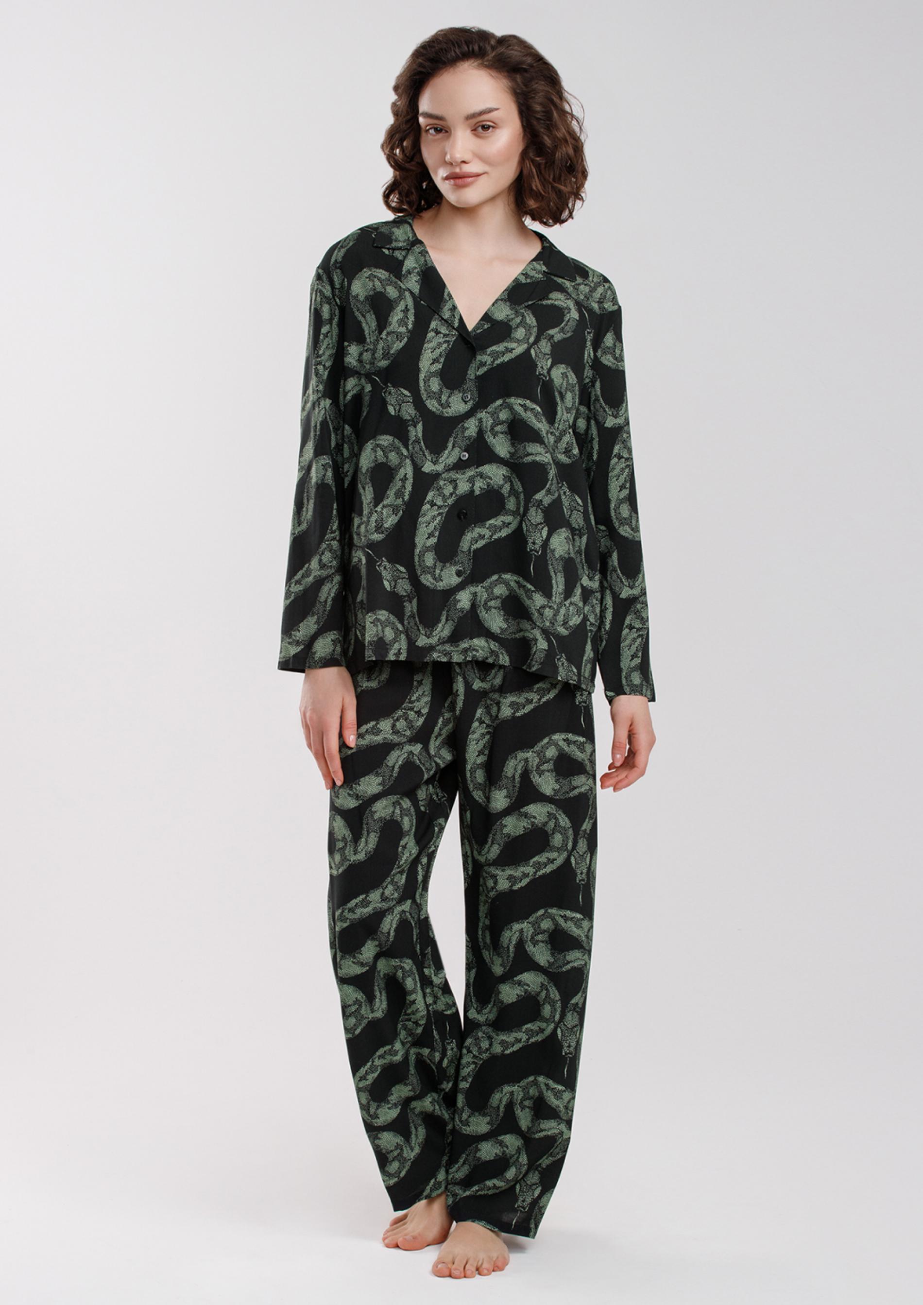 Хлопковые или льняные, шелковые или атласные — выбирайте модели в стиле минимализм либо с принтом, например, змеиным в честь символа 2025 года. Особенно актуальны пижамы с воланами на штанинах и рукавах. Завязки вместо пуговиц или в качестве декора тоже любопытный ход, который сделает образ игривым. А завершить его можно как пушистыми тапочками (непременно с носками), так и лодочками на шпильке. Праздник как-никак!