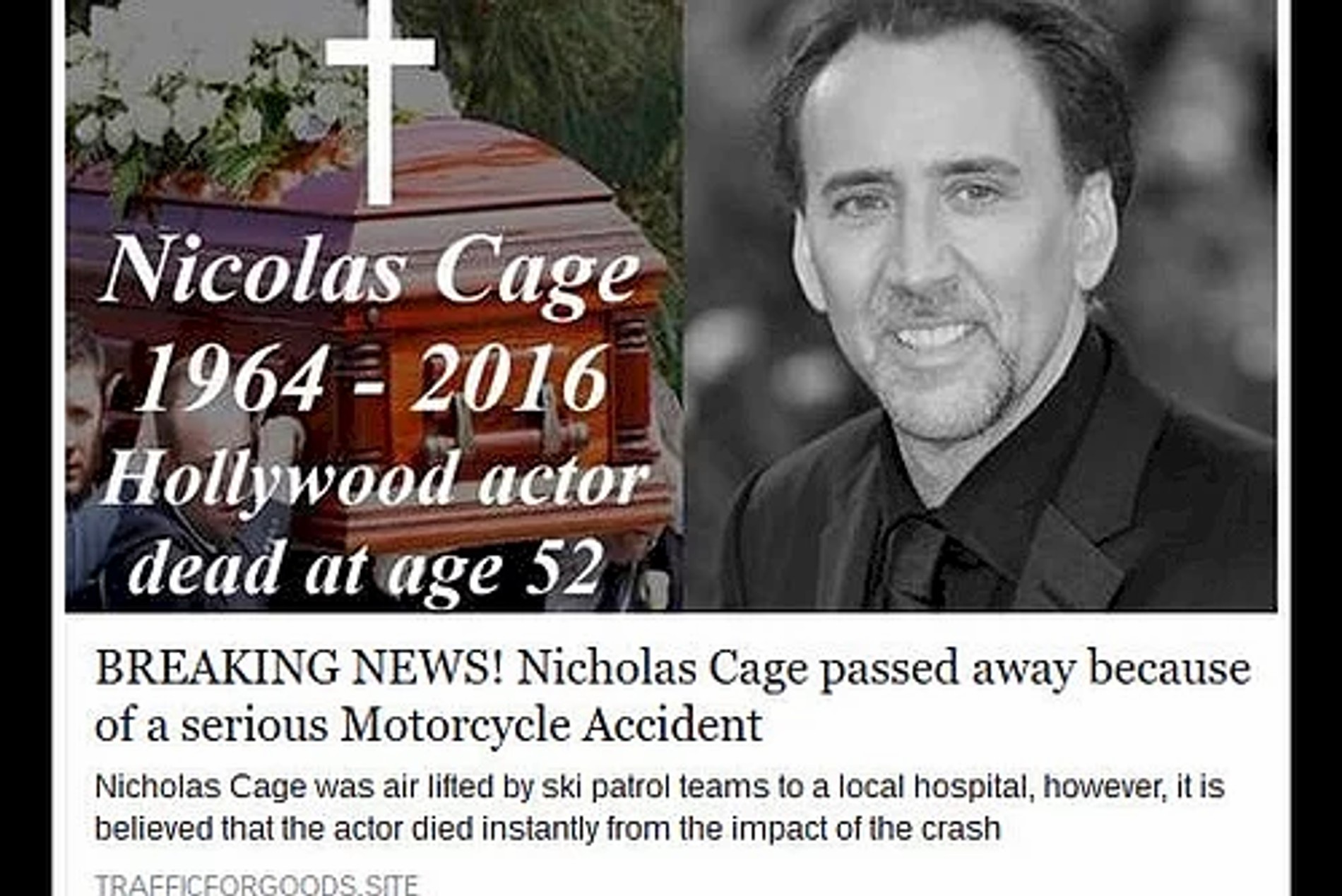 Фейковая смерть однажды настигла и Николаса Кейджа. Скрин с недобросовестного сайта, который таким образом пытался заработать на трафике, завирусился в Сети. Видимо, поклонники настолько были шокированы трагической вестью, что не обращали внимание на сомнительный источник новости. Как это часто бывает, убедительную ложь сопровождали детали — фото с похорон и подробности происшествия. Якобы Николаса доставили в местную больницу на вертолете.