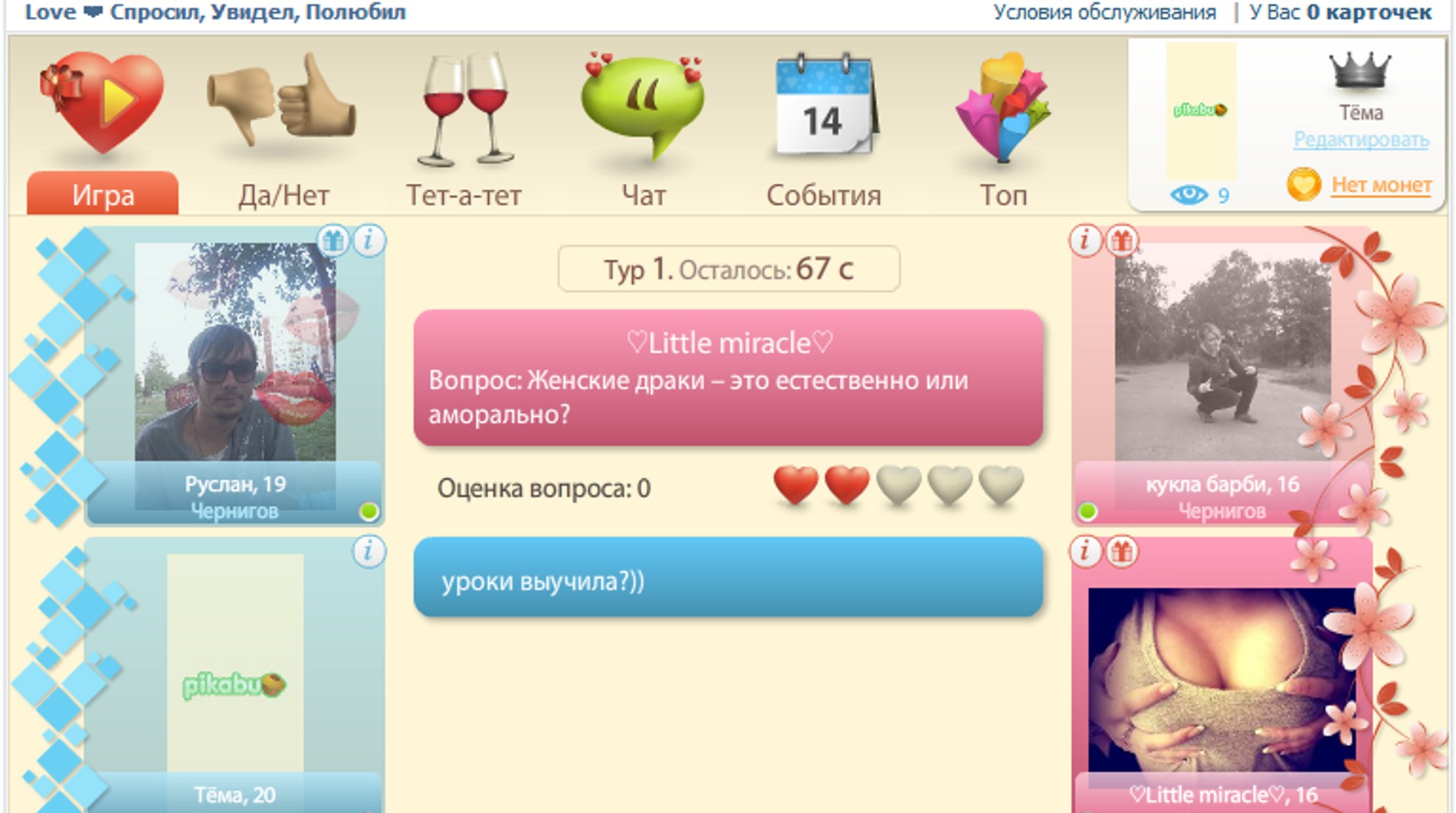 Наконец, автор наслышан, но сам не играл в игру «Рыцари и принцессы» уже в ОК. Там, как ни странно, тоже можно общаться и строить пары. Ходят слухи, что пиковым проявлением близости становится уединение в карете, которая во время свидания характерно потрясывается, а на экране появляются надписи в духе «Давай сделаем это!».