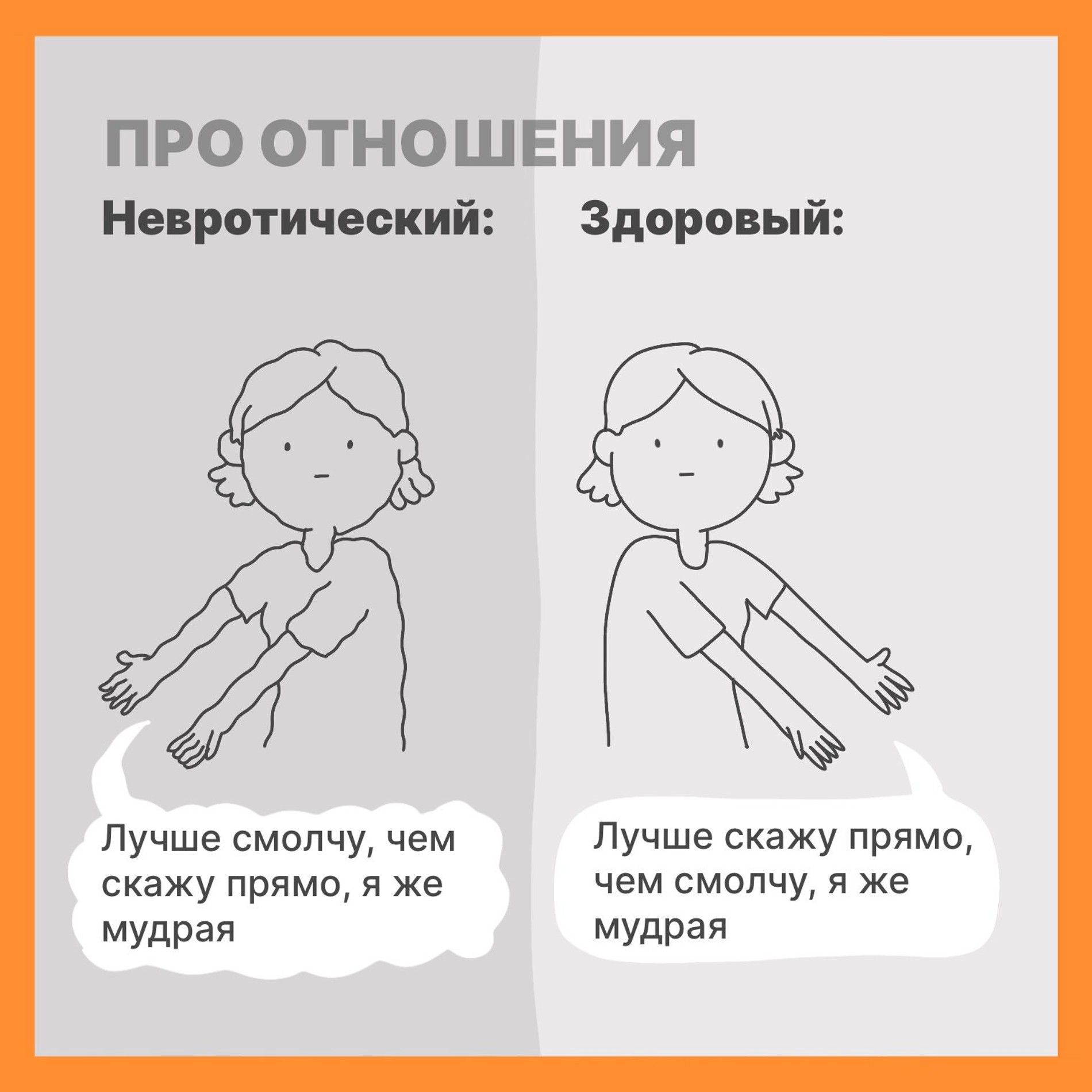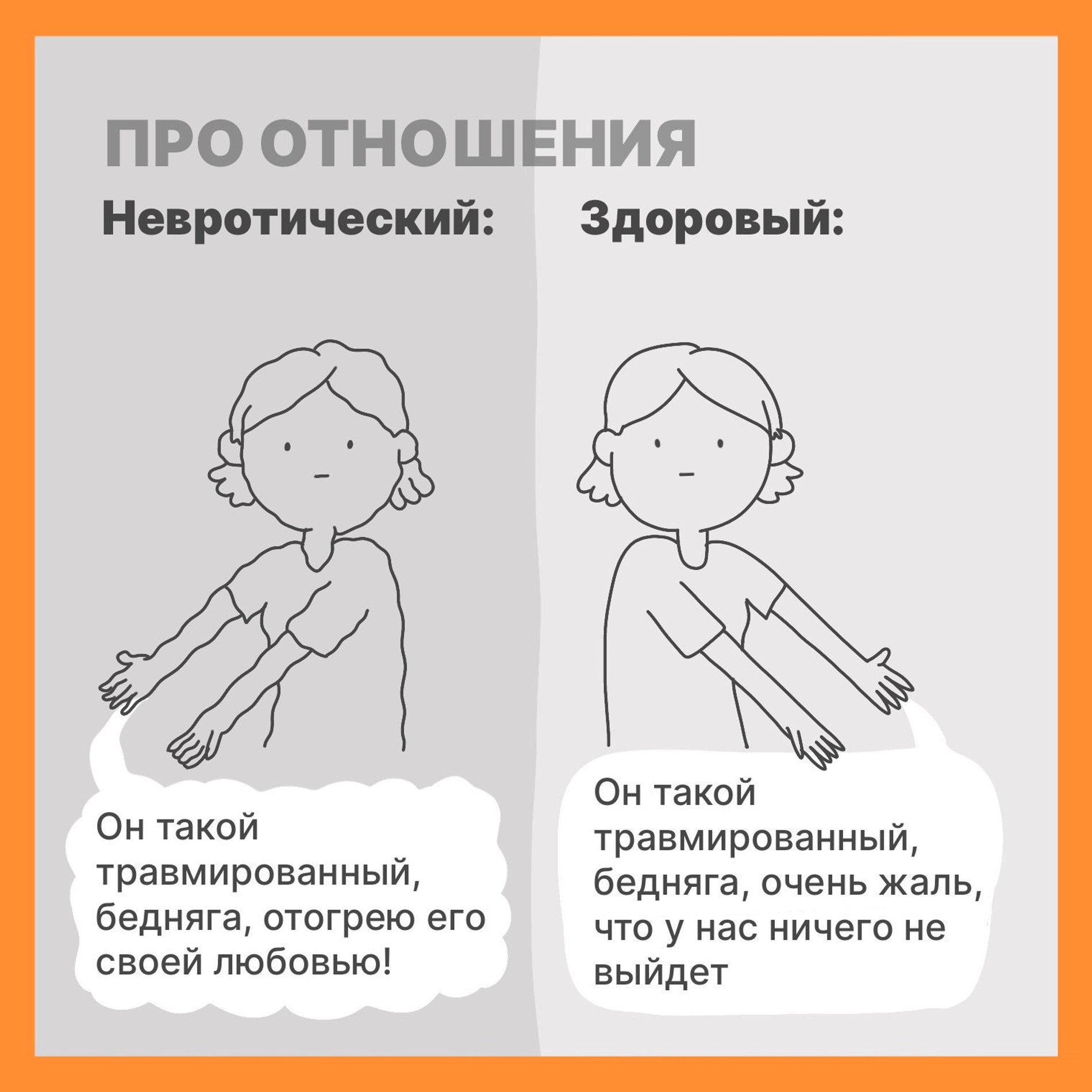 Теперь, когда вы знаете эти два главных критерия невротических отношений, можете оглянуться назад (ну или посмотреть на своего нынешнего партнера) и проверить, не замечаете ли вы чего-то похожего. А чтобы совсем облегчить задачу, Михаил опубликовал карточки с популярными сценариями и фразами — своеобразный чек-лист, который поможет вам поставить диагноз своим отношениям, прошлым или текущим.