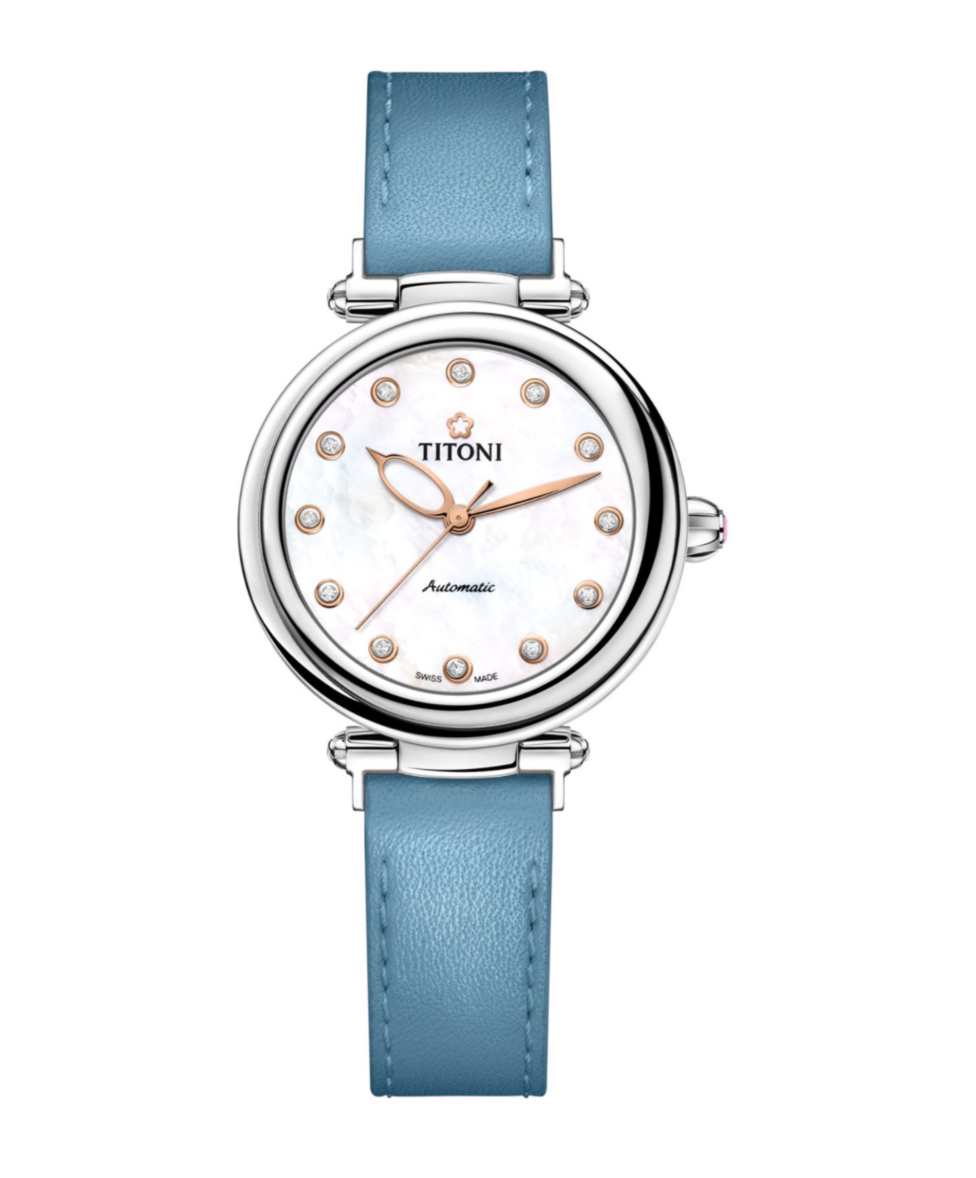 Любительницам элегантного минимализма посвящается — механические часы Miss Lovely от швейцарской марки Titoni. Героиня коллекции — целеустремленная женщина, которая знает себе цену и ведет активный образ жизни. Таким же активным образом она в зависимости от настроения может легко заменить и ремешок у своего аксессуара, выбрав кожаный вариант другого цвета или стальной браслет. Циферблат часов украшен 12 кристаллами, перламутром и оригинальным сетом из стрелок.
