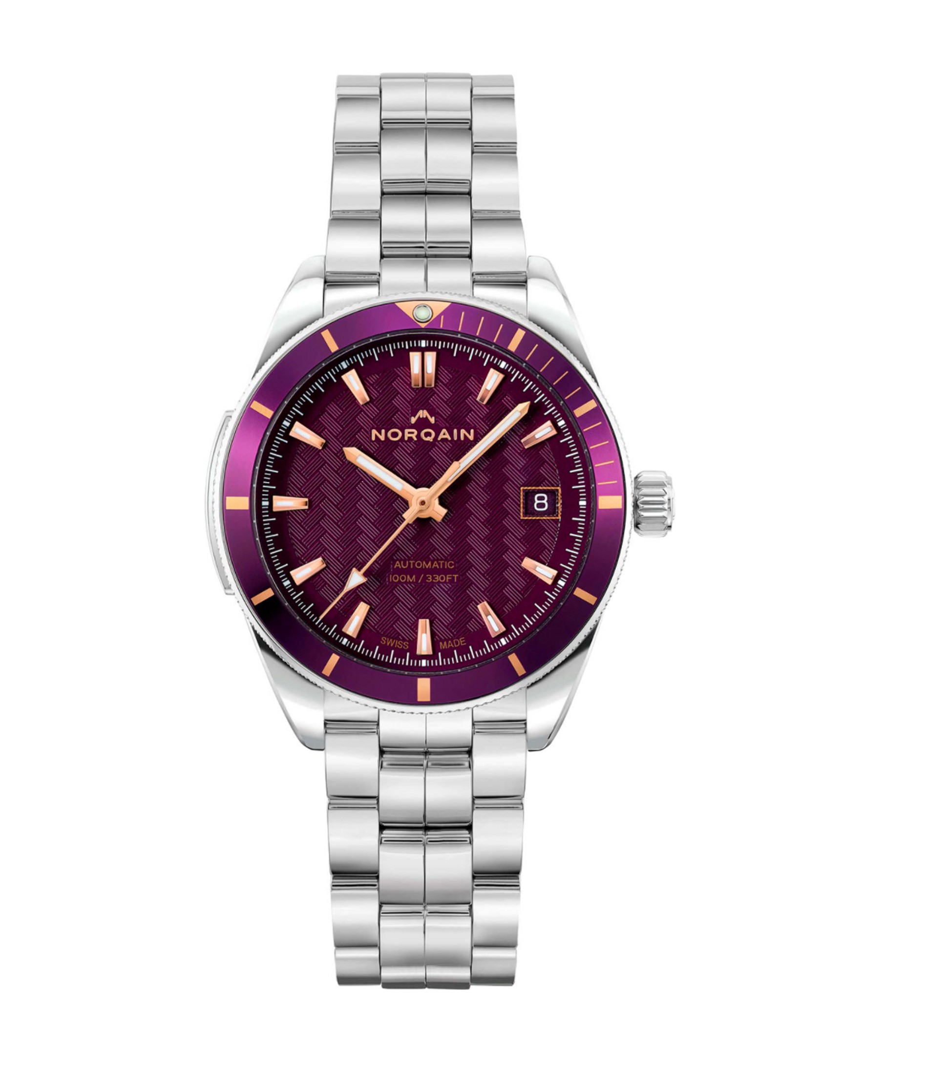 Расширяем сознание вместе с женскими часами Adventure Sport от швейцарской компании NORQAIN: с точки зрения психологии именно такой эффект на человека оказывает фиолетовый цвет, в котором и выполнен циферблат стильного аксессуара. Название модели с люминесцентными стрелками и метками сочетает в себе приключения и спорт. Да, такой аксессуар определенно прописан по-настоящему увлеченным и стремящимся к развитию личностям.