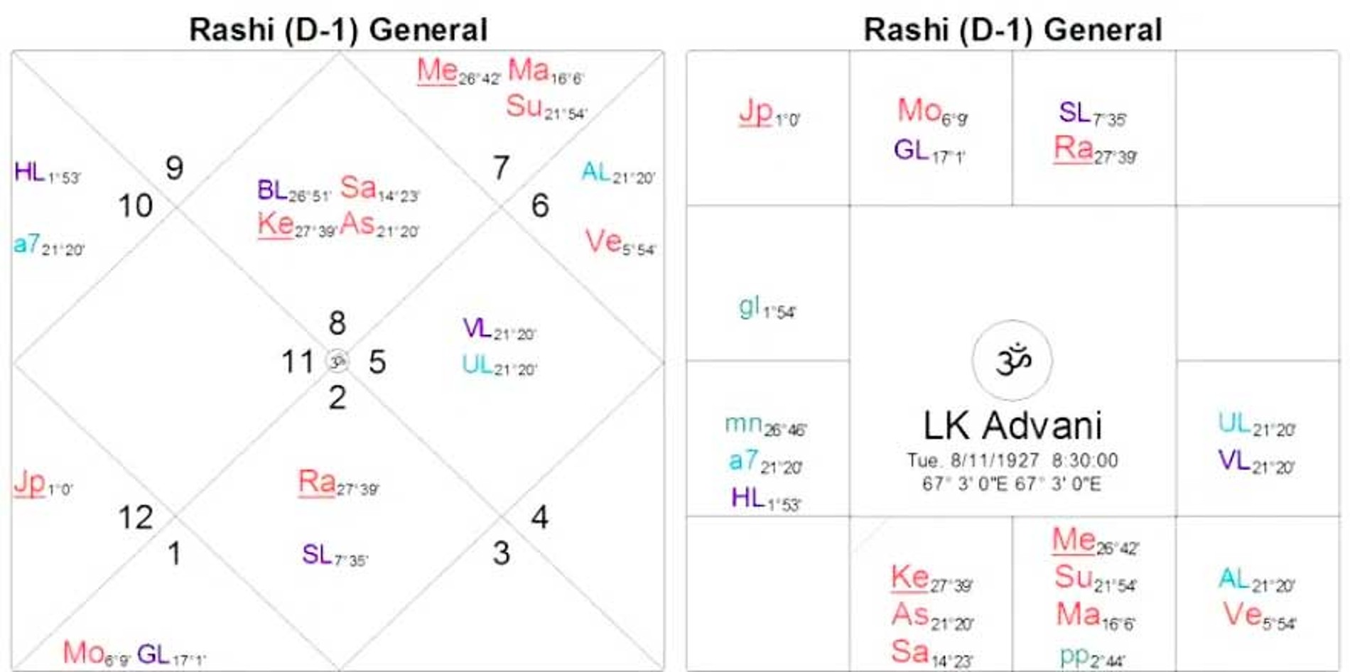 В целом карта рождения джйотиш — раши — напоминает свой аналог из западной астрологии: на ней изображены зодиаки и планеты, подчиненные четырем элементам (огонь, вода, земля, воздух), в домах. Раши строят по южному и северному стилю: в первом сегменты, на которые разбивают карту, имеют вид ромбов, во втором — квадратов. И южноиндийская, и северноиндийская раши делятся на 12 зодиаков по 30 градусов и 27 накшатр, разбивающих зодиак на 3 сектора.