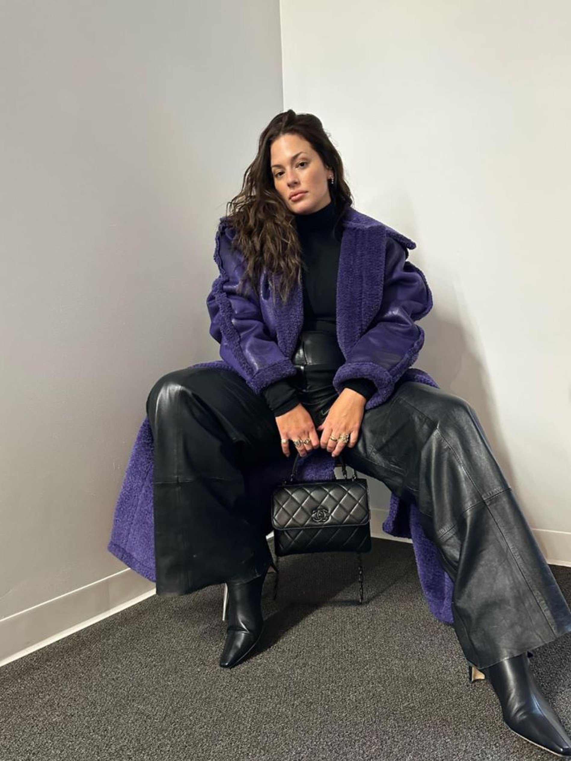 Хотя полностью черный лук — бессмертная классика, иногда не помешает добавить немного цвета в образ. Хороший пример — комплект Эшли Грэм. Модель успешно объединила черную классическую водолазку, выразительные кожаные брюки и пальто насыщенного фиолетового цвета: приподнятое настроение обеспечено даже в самый серый зимний день.