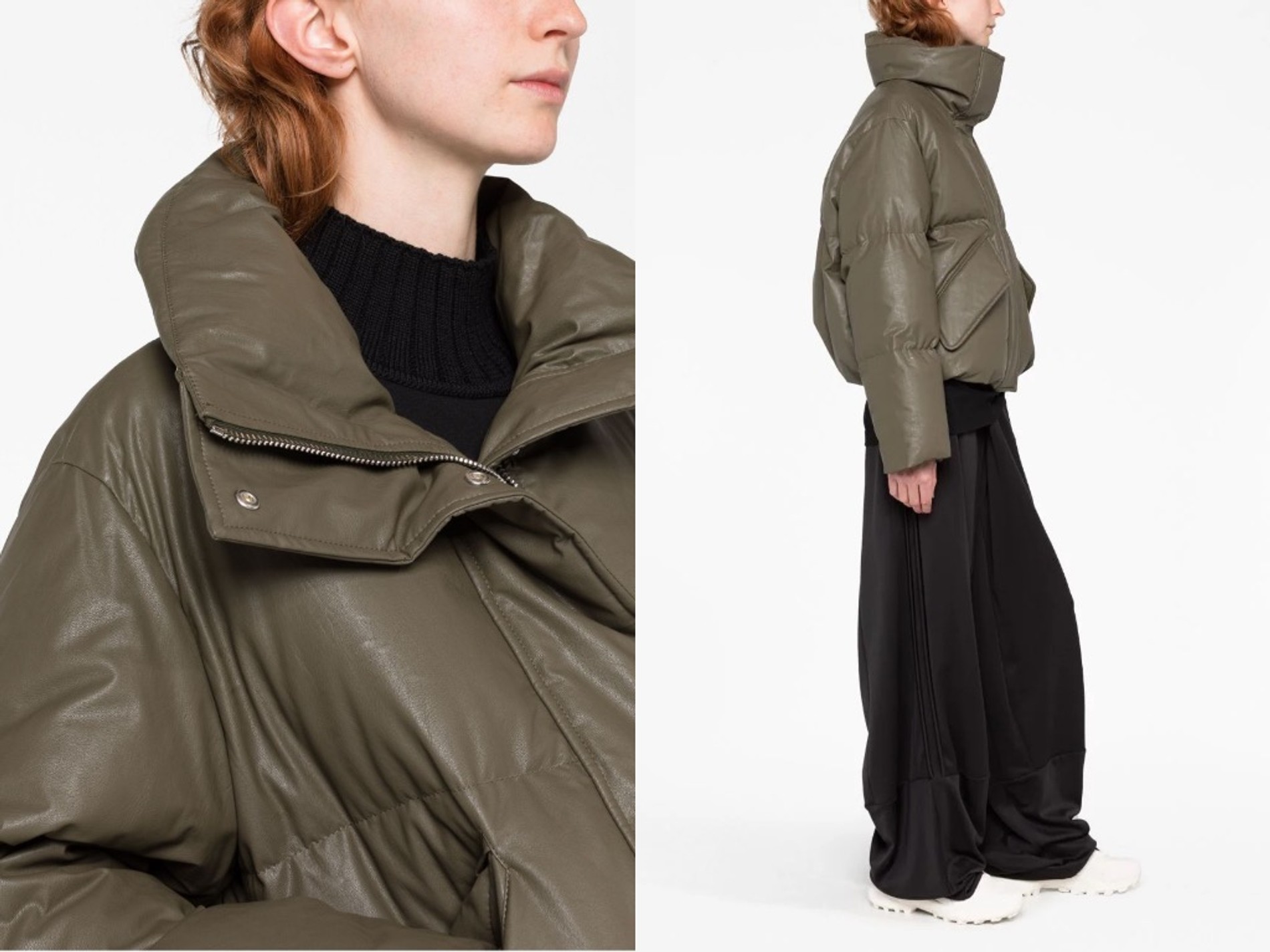Наденьте под пуховик любую базовую вещь, но позаботьтесь о том, чтобы штанины были широкими. Обувь подойдет самая простая: кроссовки или лаконичные ботинки. Главное в образе — соблюсти пропорции, особенно если вы выбрали, например, брюки асимметричного кроя, как на модели.