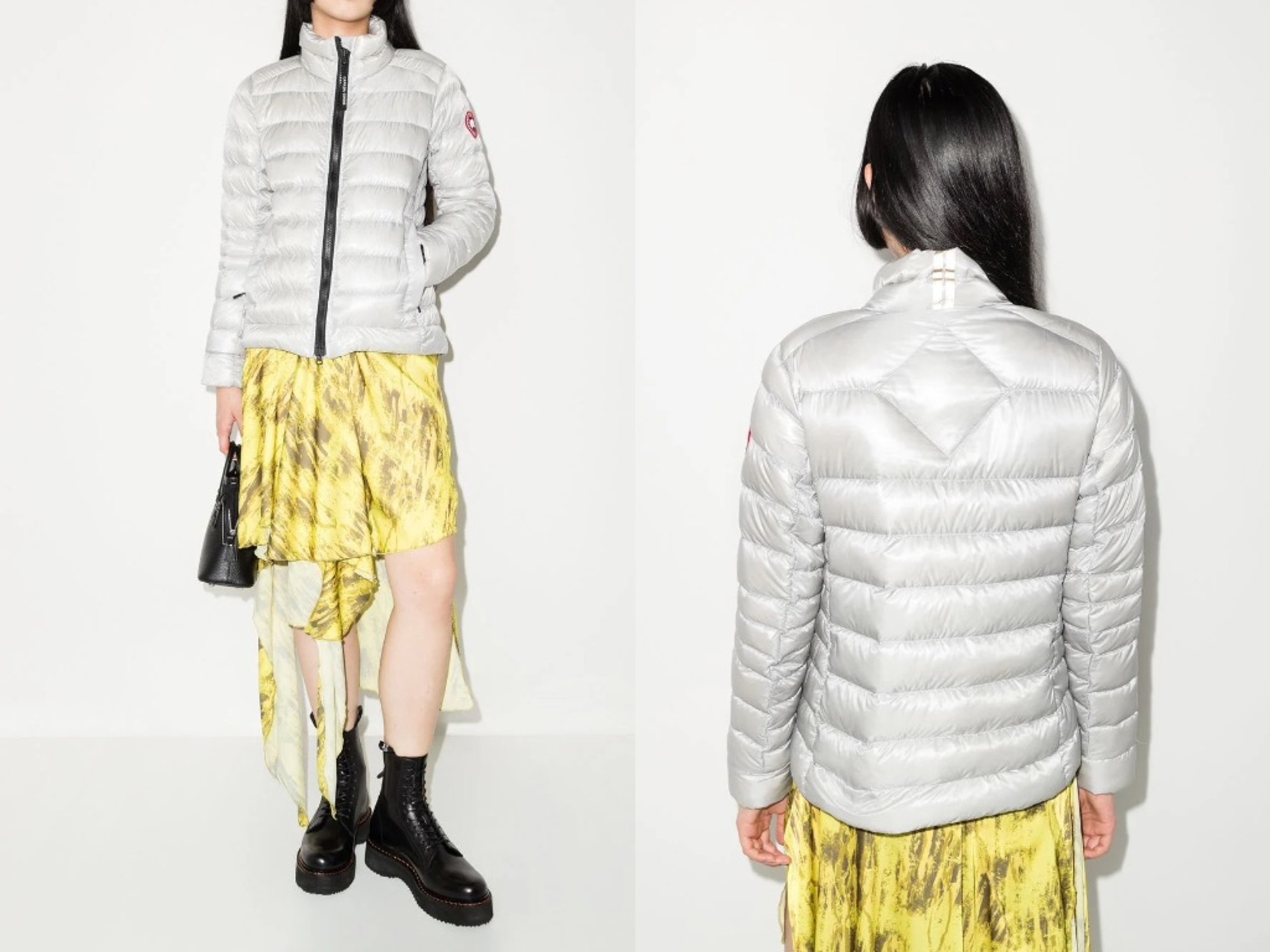 Пожалуй, самый нарядный вариант, который уместен по дороге на вечеринку, состоит из платья-комбинации с узором, ботинок, собственно стеганого пуховика и сумки тоут в тон обуви. Как вам такая идея?