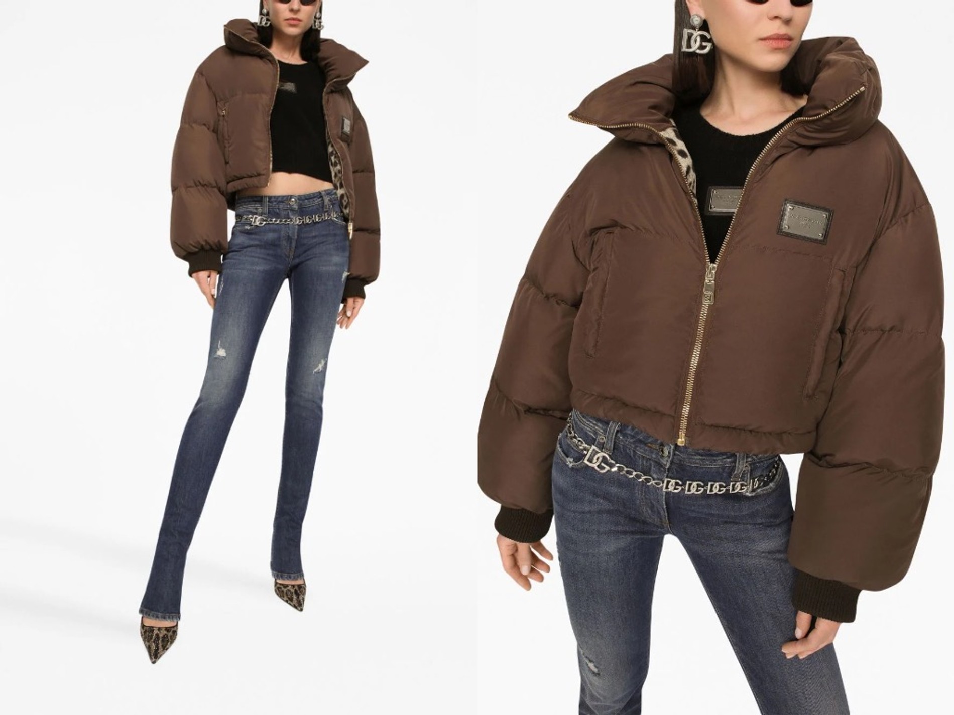 На модели — укороченный пуховик Dolce & Gabbana шоколадного цвета. Не важно, какой бренд у вас в гардеробе. Главное, что короткая куртка стабильно выгодно смотрится в сочетании с узкими джинсами и классическими туфлями на каблуке.