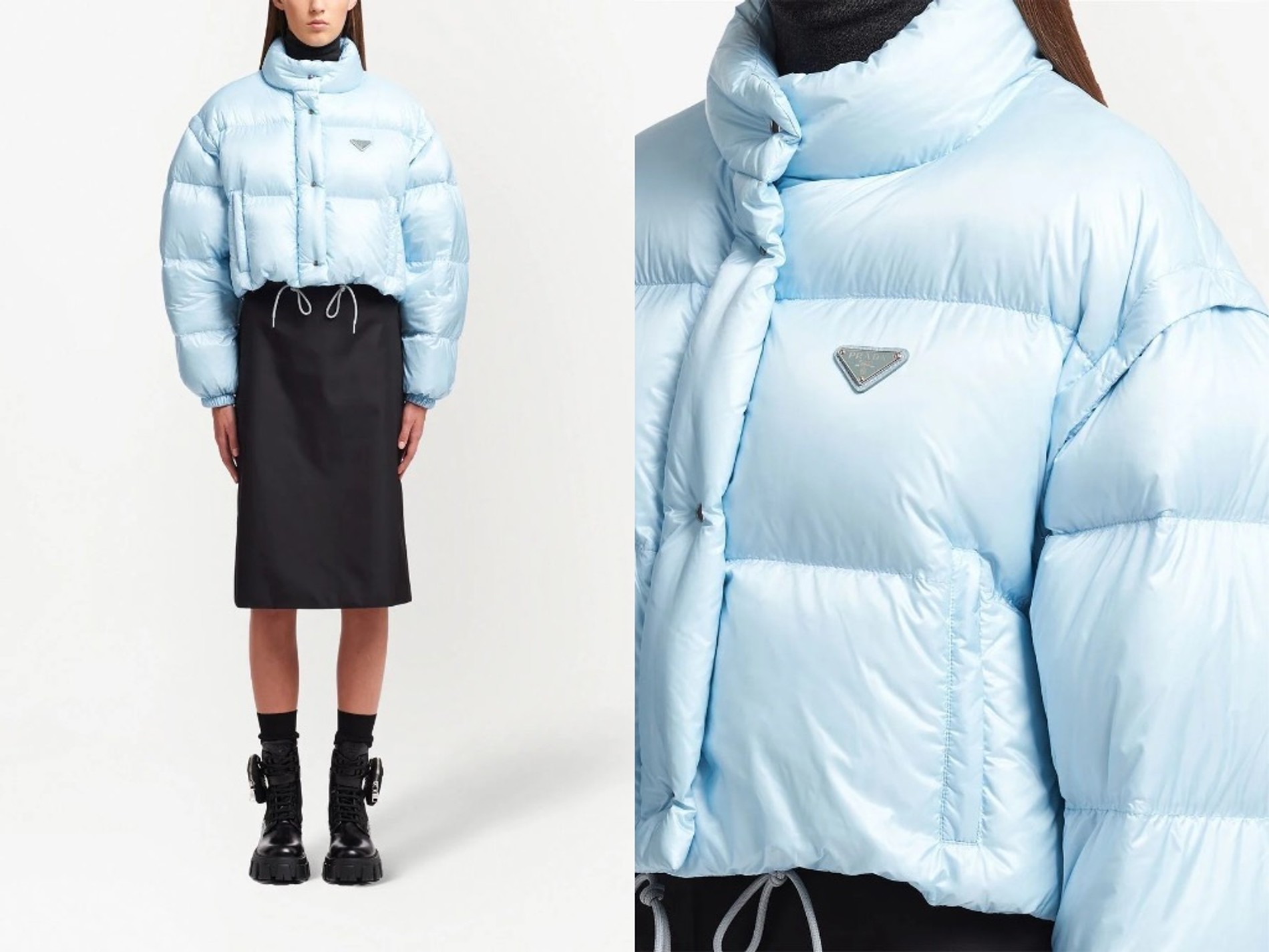 Светлая куртка и прямая простая юбка ниже колена — чем не идея? Кстати, у этого пуховика от Prada съемные рукава. Стоит их отстегнуть, и зимняя верхняя одежда превращается в стильный жилет, в котором будет комфортно даже в помещении. Прохладном, разумеется. Отдельно отметим резинки с фиксаторами, которые абсолютно органичны в качестве функционального декора.