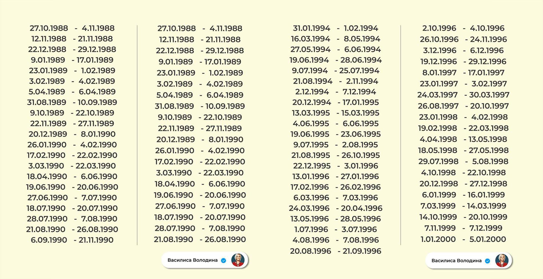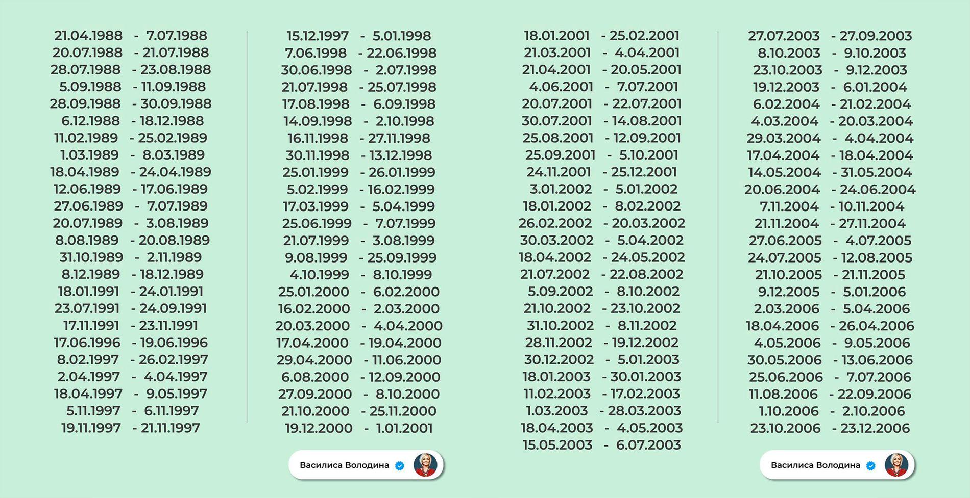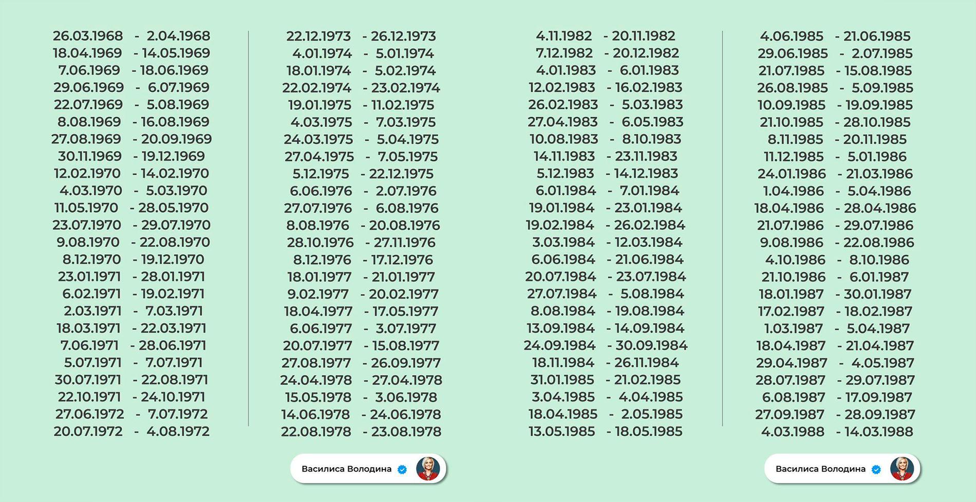 «Следуйте своим планам, но спокойно — принимая как данность, что жизнь может вставлять самые разнообразные палки в колеса. Тщательно анализируйте допущенные ошибки и старайтесь их исправить в будущем», — посоветовала Володина. А в качестве сравнения привела несданный экзамен с последующей переэкзаменовкой. Берите на вооружение, если видите свою дату рождения в таблице ниже!