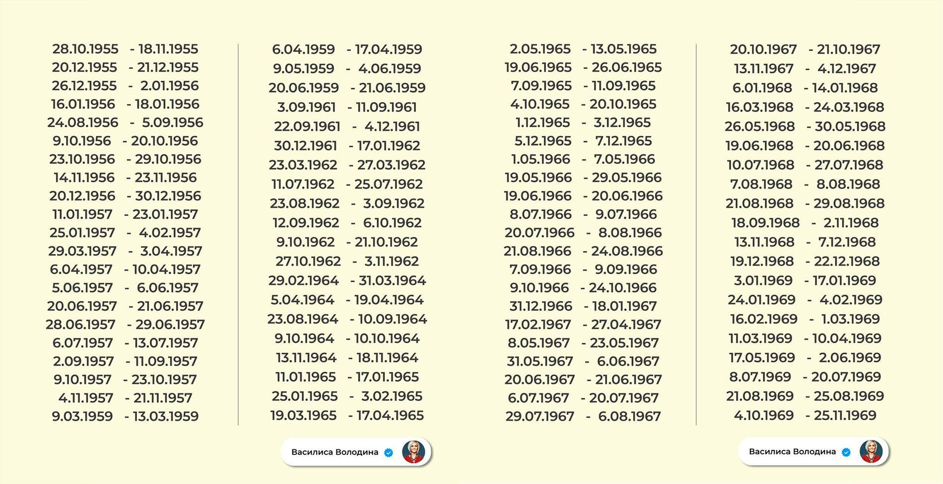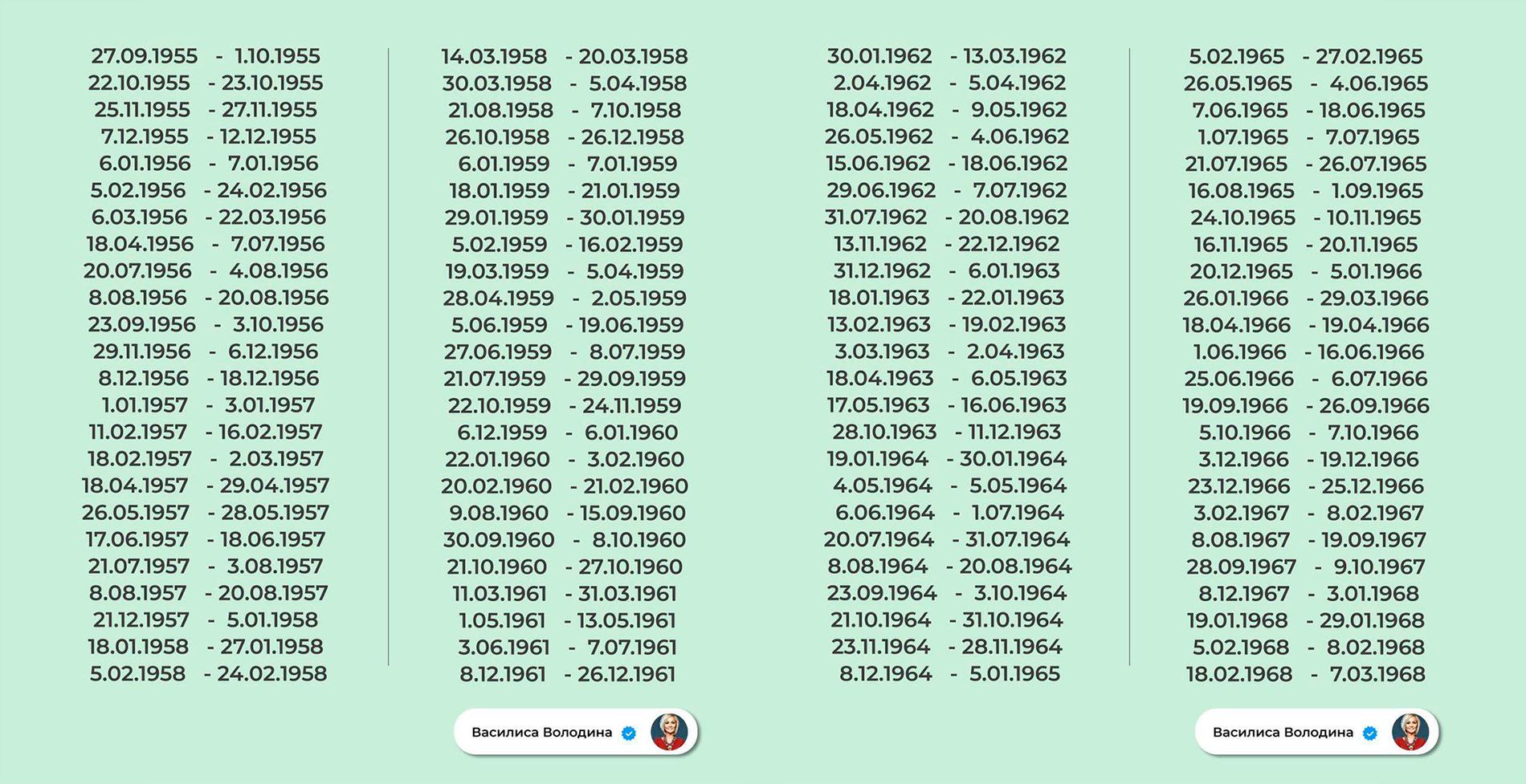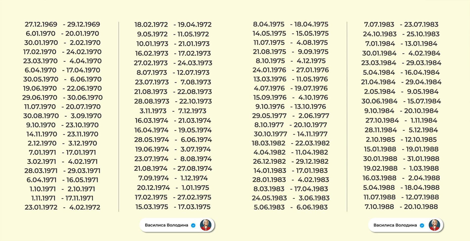 «Следуйте своим планам, но спокойно — принимая как данность, что жизнь может вставлять самые разнообразные палки в колеса. Тщательно анализируйте допущенные ошибки и старайтесь их исправить в будущем», — посоветовала Володина. А в качестве сравнения привела несданный экзамен с последующей переэкзаменовкой. Берите на вооружение, если видите свою дату рождения в таблице ниже!