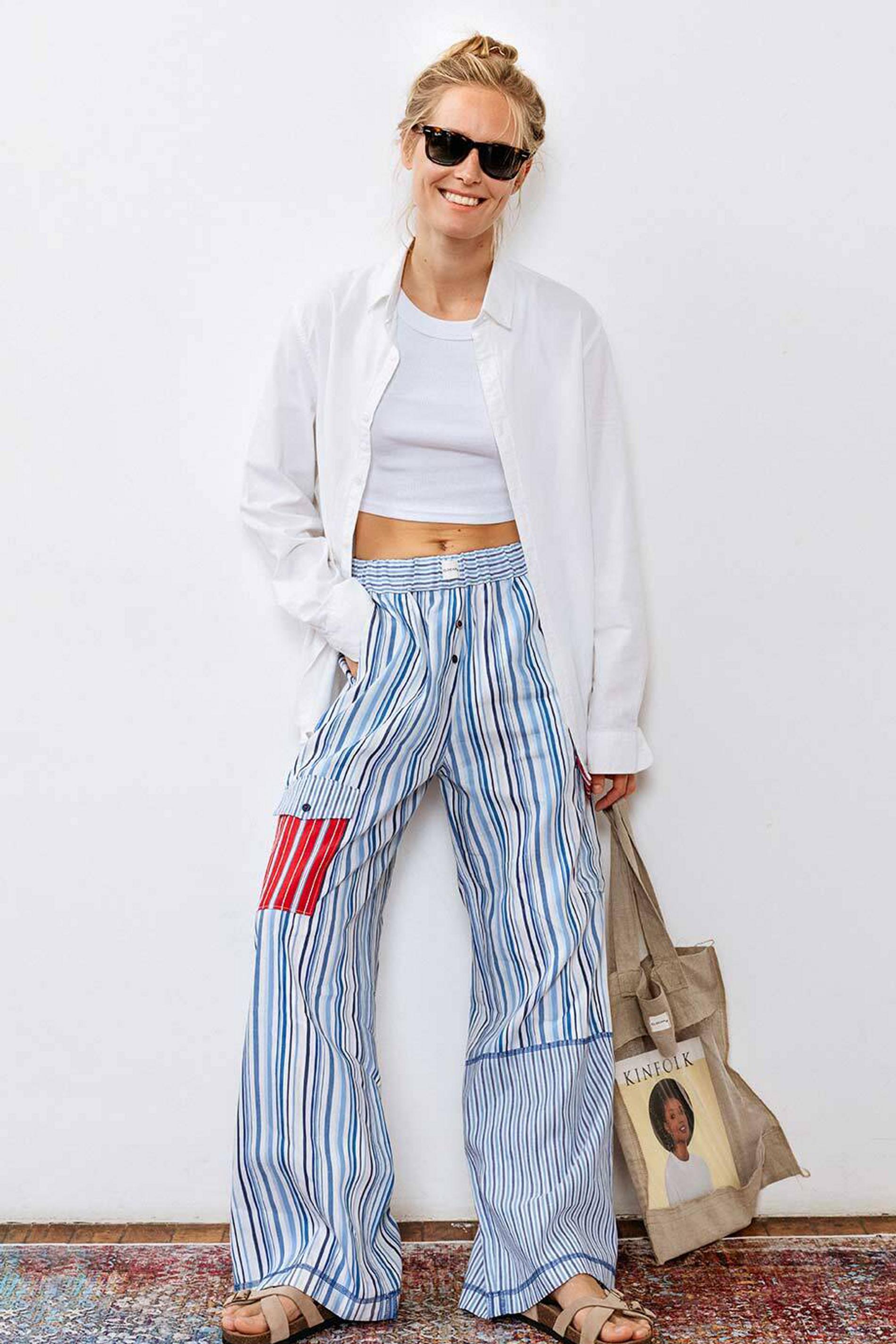 Прошлым летом с легкой руки инфлюенсеров самые обычные пижамные штаны — голубые, белые, в полоску или в клетку, на завязках или с пуговицами на гульфике — выбрались из спальни на улицу. В текущем сезоне, на который пришелся пик их популярности, они доказали, что достойны звания «универсальный солдат». А все потому, что вопрос «С чем носить?» здесь не стоит. Каким бы специфичным ни казался «домашний» низ, стилизовать его можно как угодно.