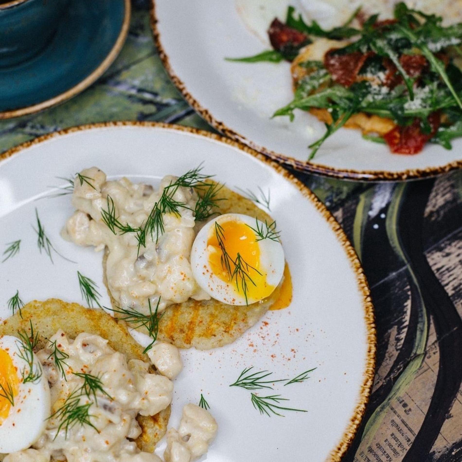 Завтраки здесь подают весь день напролет. Впрочем, все «утренние» блюда звучат настолько замысловато, что подойдут и для обеда, и для ужина. Например, картофельные блинчики с цыпленком и белыми грибами. Есть в кафе и более сытные позиции, вроде пасты с цыпленком, томатами и цукини, сырного супа и киша (из начинок — индейка, груша, голубой сыр или порей и креветки).