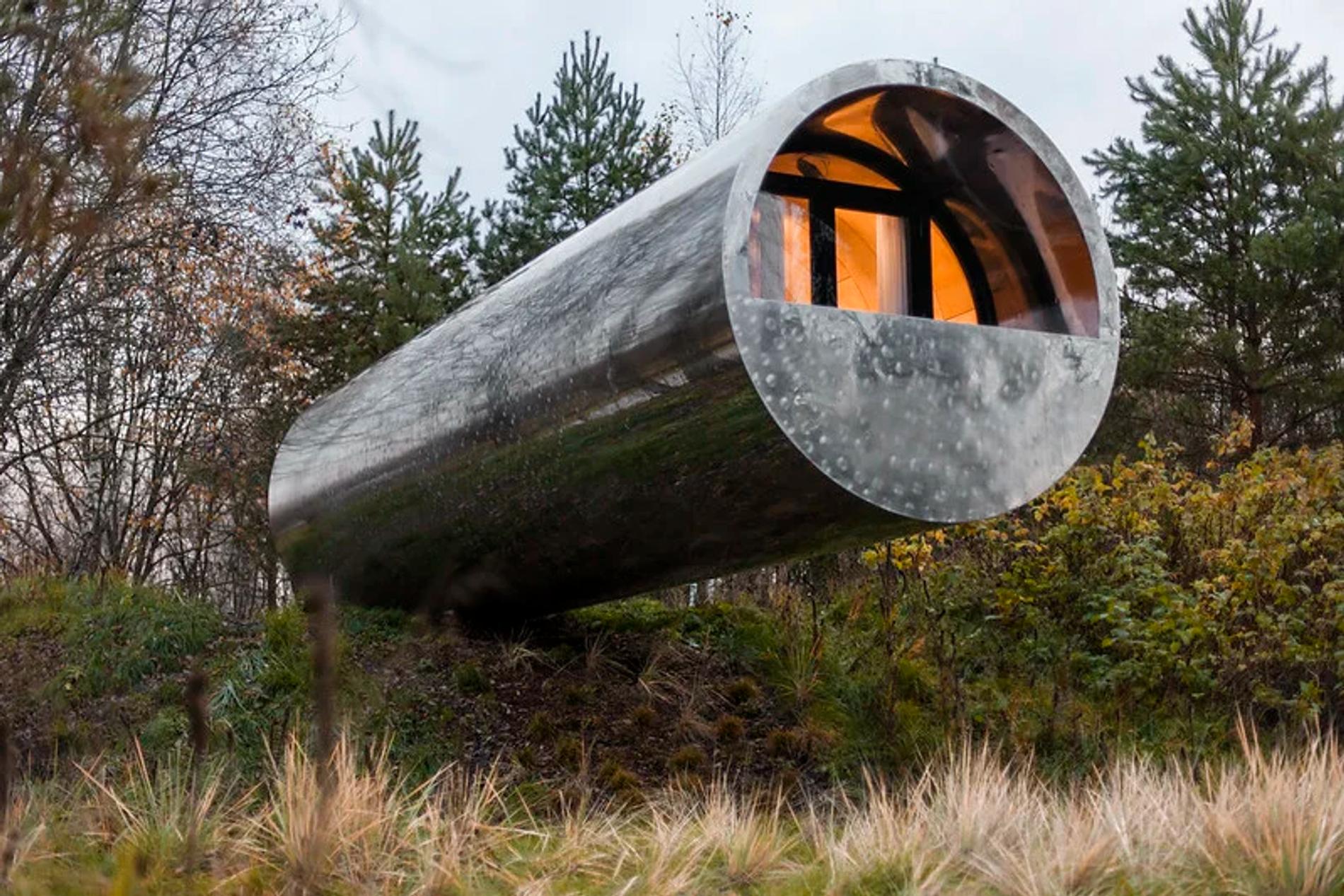 Металлическая труба зависла в воздухе над пригорком, а внутри — домик: кровать, стол, стулья-пеньки, душевая. Все комфортно встроено в цилиндрическое пространство. Изначально павильон построен в качестве очередного арт-объекта в парке «Никола Ленивец», но впоследствии его стали использовать по назначению.