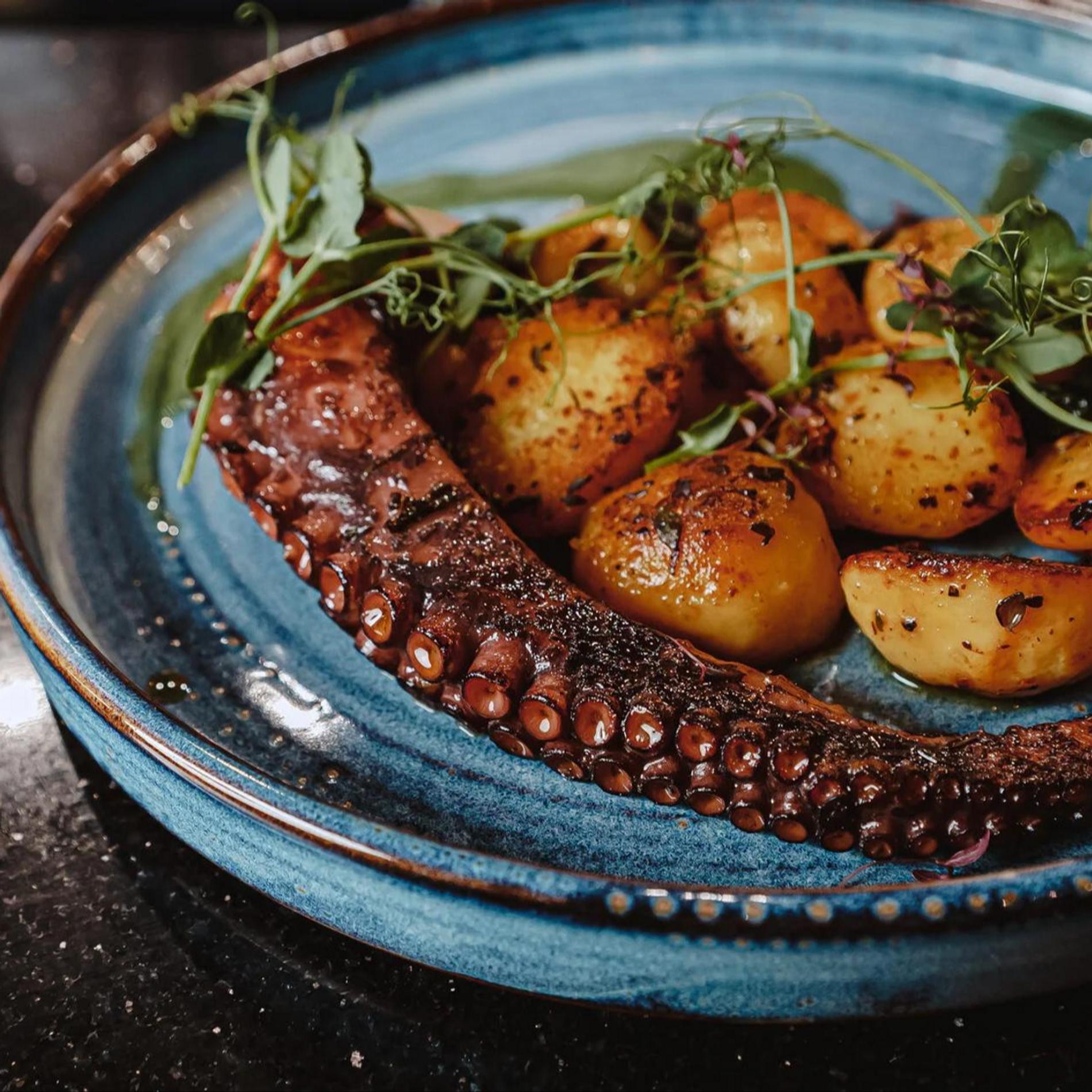 Морепродукты доставляют в ресторан из Шри-Ланки и с Дальнего Востока. В меню — с десяток видов устриц, гребешки, креветки, осьминоги и ежи. Рыбу — дорадо, групер, снеппер, сибас — могут приготовить на гриле или запечь в соли, а также подать в виде севиче или крудо.