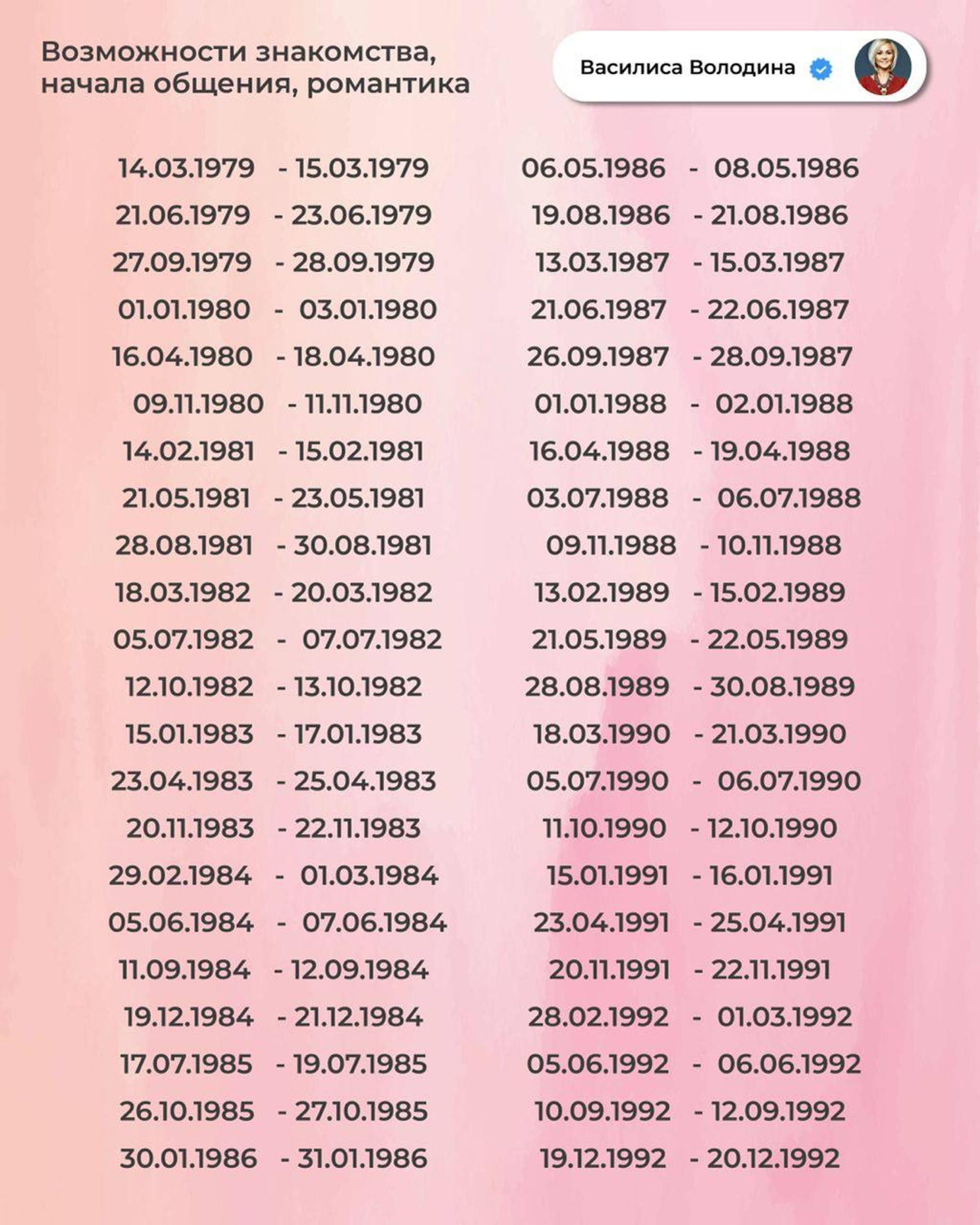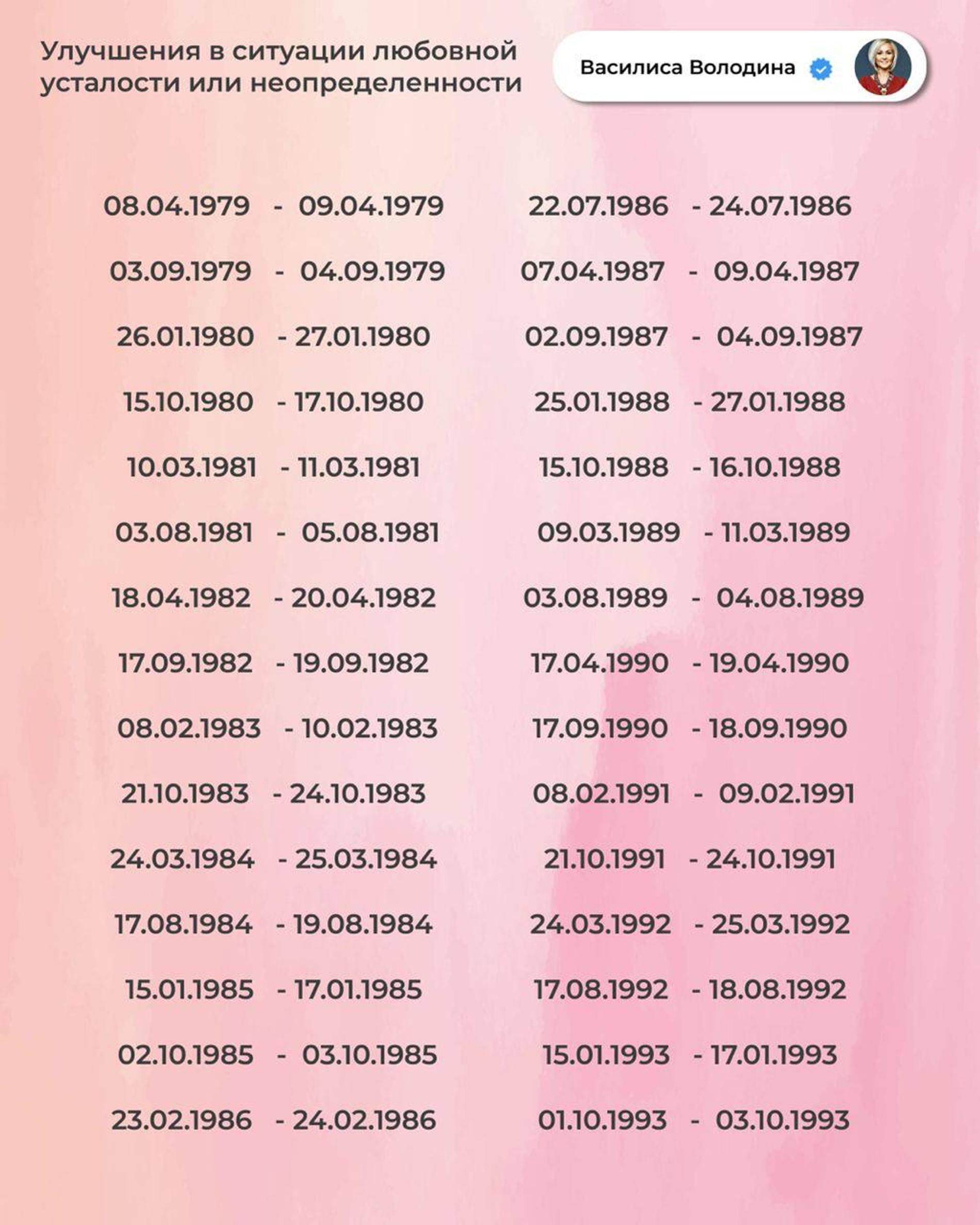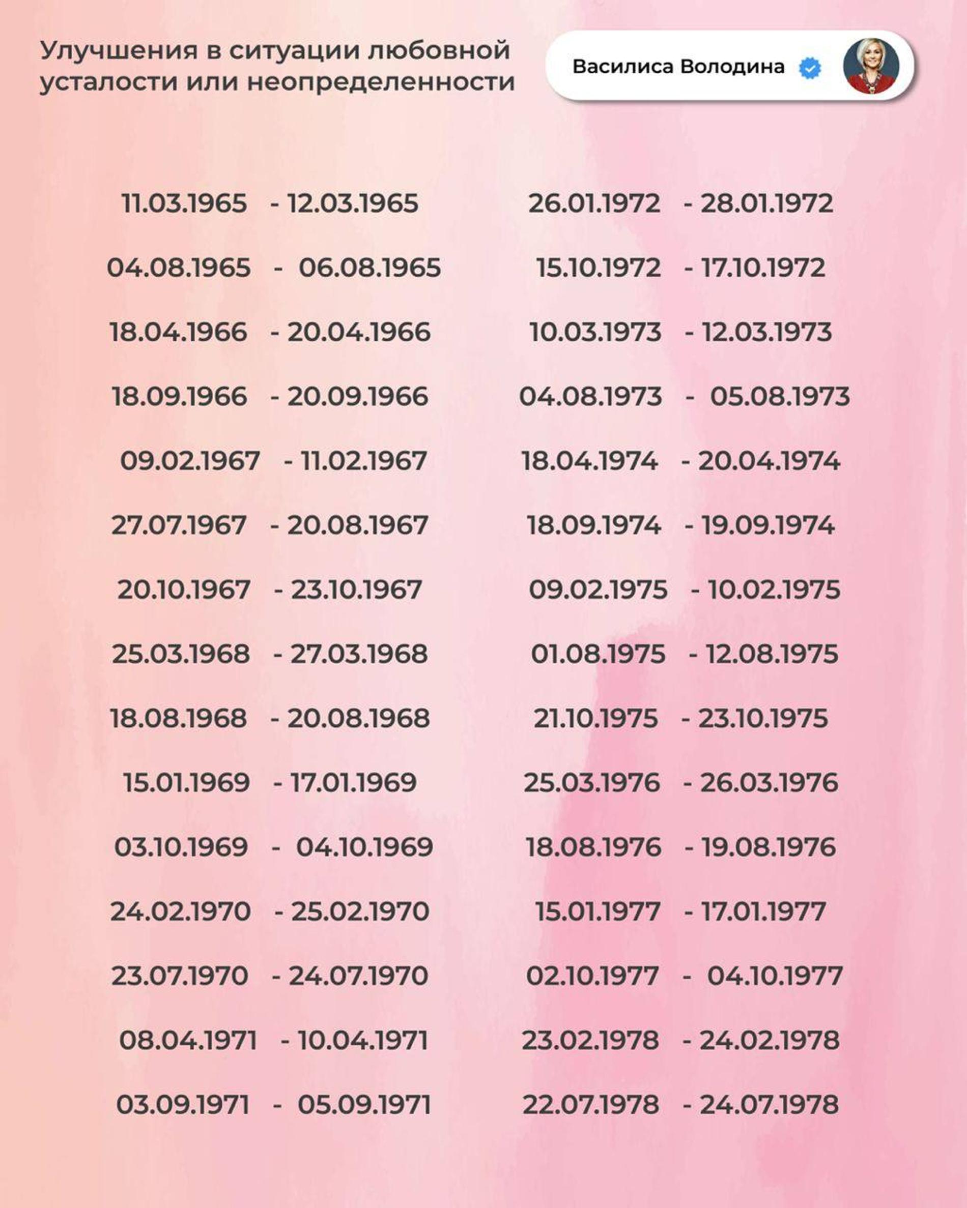 «Сегодня — о любви. Точнее, о тех, кому именно в ближайшее время жизнь дарит шансы на приятное знакомство или просто любовные радости, улучшения в личной жизни», — заявила Василиса и опубликовала даты рождения счастливчиков. Надо признать, таковых сегодня с легкой руки Василисы Володиной и по велению звезд весьма много — целых 9 страниц! А значит, шансы обнаружить в заветном списке дату своего рождения по-настоящему велики. Свои мы там уже нашли, чего и вам желаем!