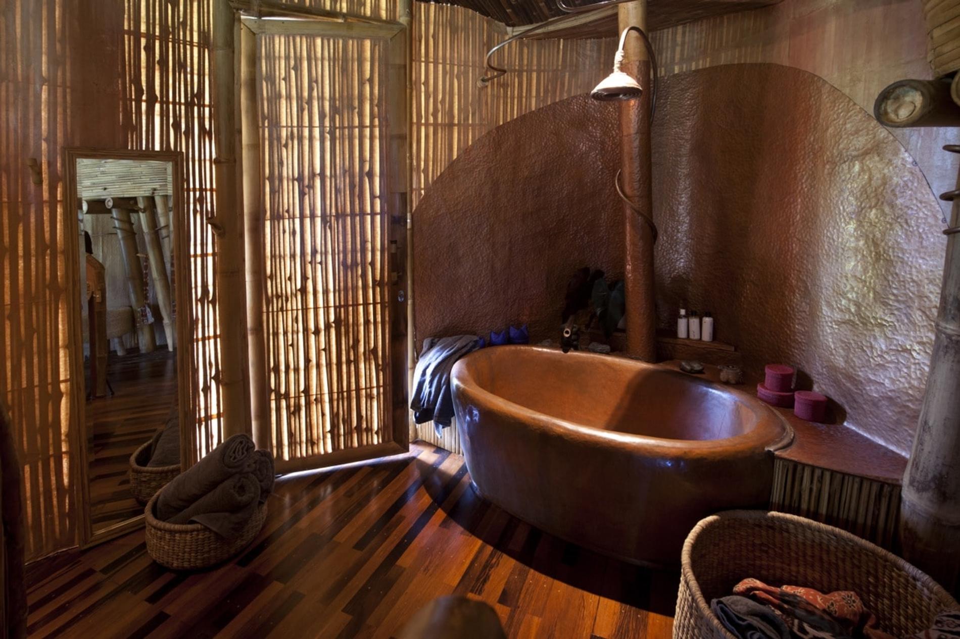 На территории 12 вилл, которые доступны туристам. В каждой — по несколько спален, гостиных и ванных комнат. Стоит ли говорить, что все, в том числе мебель, сделано из бамбука? К планировке дизайнеры подошли креативно, постаравшись обеспечить гостям максимальное единение с природой. Необходимый эффект удалось достичь довольно просто — долой стены! Даже в ванных комнатах перегородок минимум: панорамные окна, которые можно лишь занавесить шторкой (никаких стекол), «смотрят» на джунгли. Создатели уверены: такая концепция, как бы то ни было, дарит ощущение уюта. Все же на заре человечества все жили в пещерах.