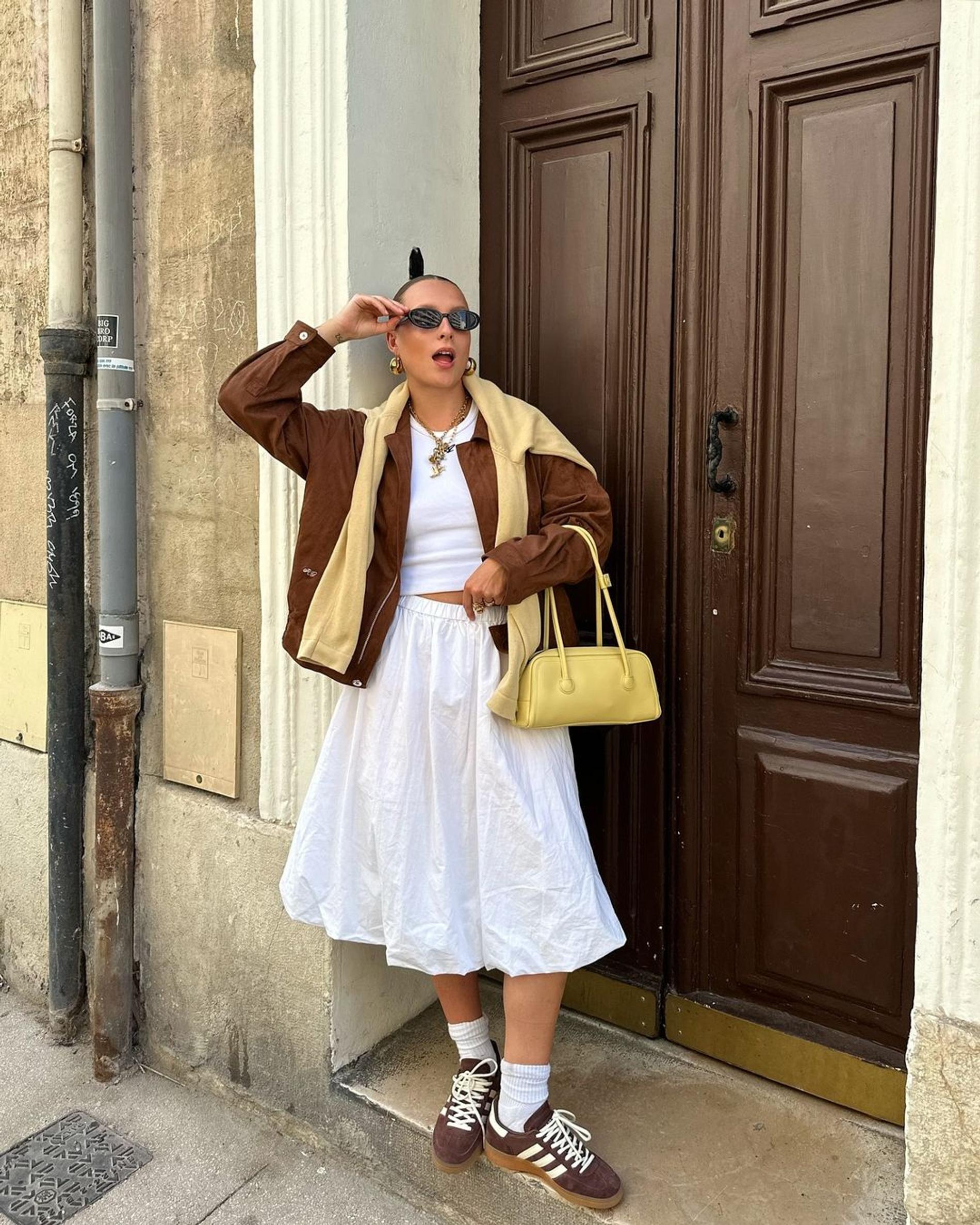 Каким бы летним ни казался цвет сливочного масла, он благополучно вписался в осенние реалии. Его нежный оттенок наилучшим образом подчеркивает мягкость замши. Составляя образ, помним формулу «Каждой твари по паре». Поэтому бомбер сочетаем с кедами, джемпер — с сумкой, а юбку-баллон — с майкой.
