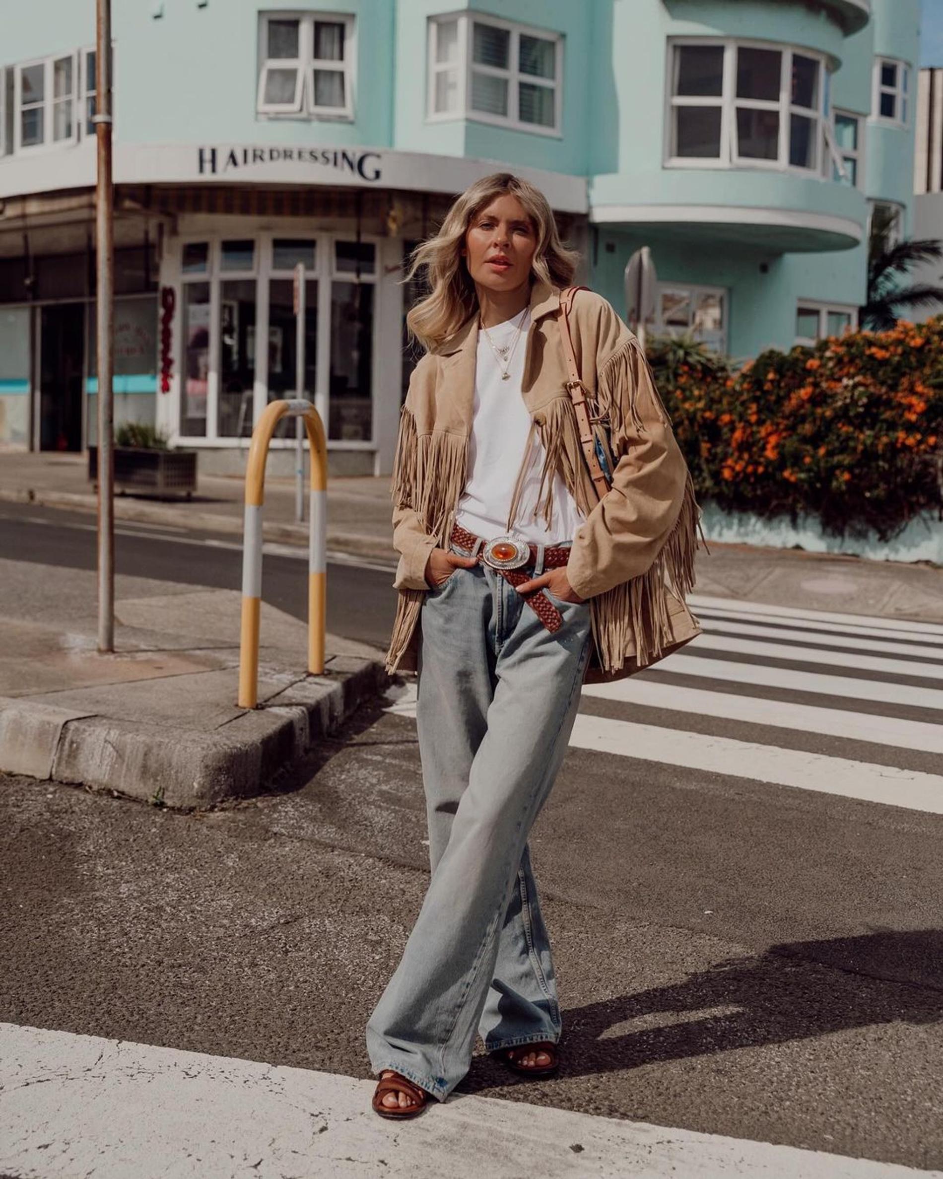 На удивление, бахрома оказалась довольно «живучей» тенденцией. С новым витком популярности стиля бохо и ковбойской эстетики тонкие полоски кожи украсили и замшевые куртки. Чтобы совсем уж не выглядеть владелицей ранчо, пусть остальные вещи в образе будут как можно более лаконичными: базовые джинсы и футболка.