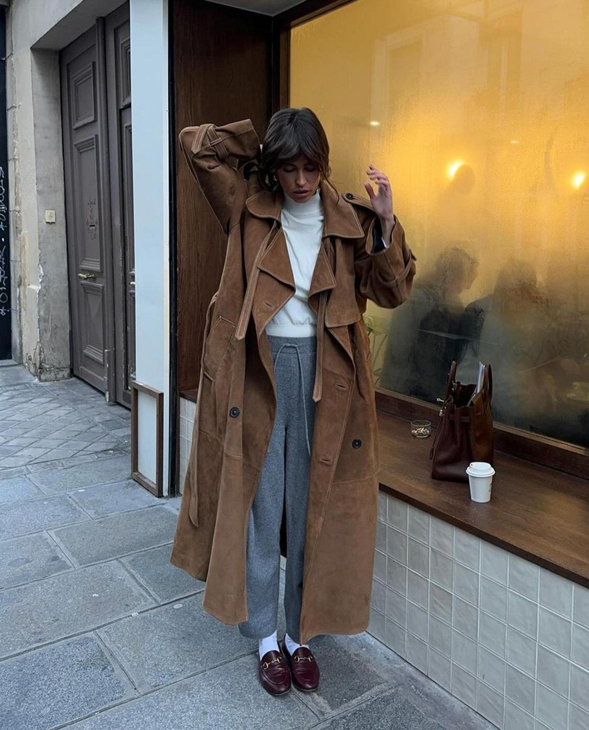 Кажется, на смену завирусившемуся кожаному плащу в оттенке бургунди пришел другой герой — тренч из замши. И тут стоит отметить: несмотря на свой классический характер, тренчкот легко комбинируется с вещами в спортивном стиле. Взять, например, серые штаны, которые сейчас активно продвигают инфлюенсеры. Строгие лоферы и лаконичная водолазка придадут таким брюкам интеллигентности.