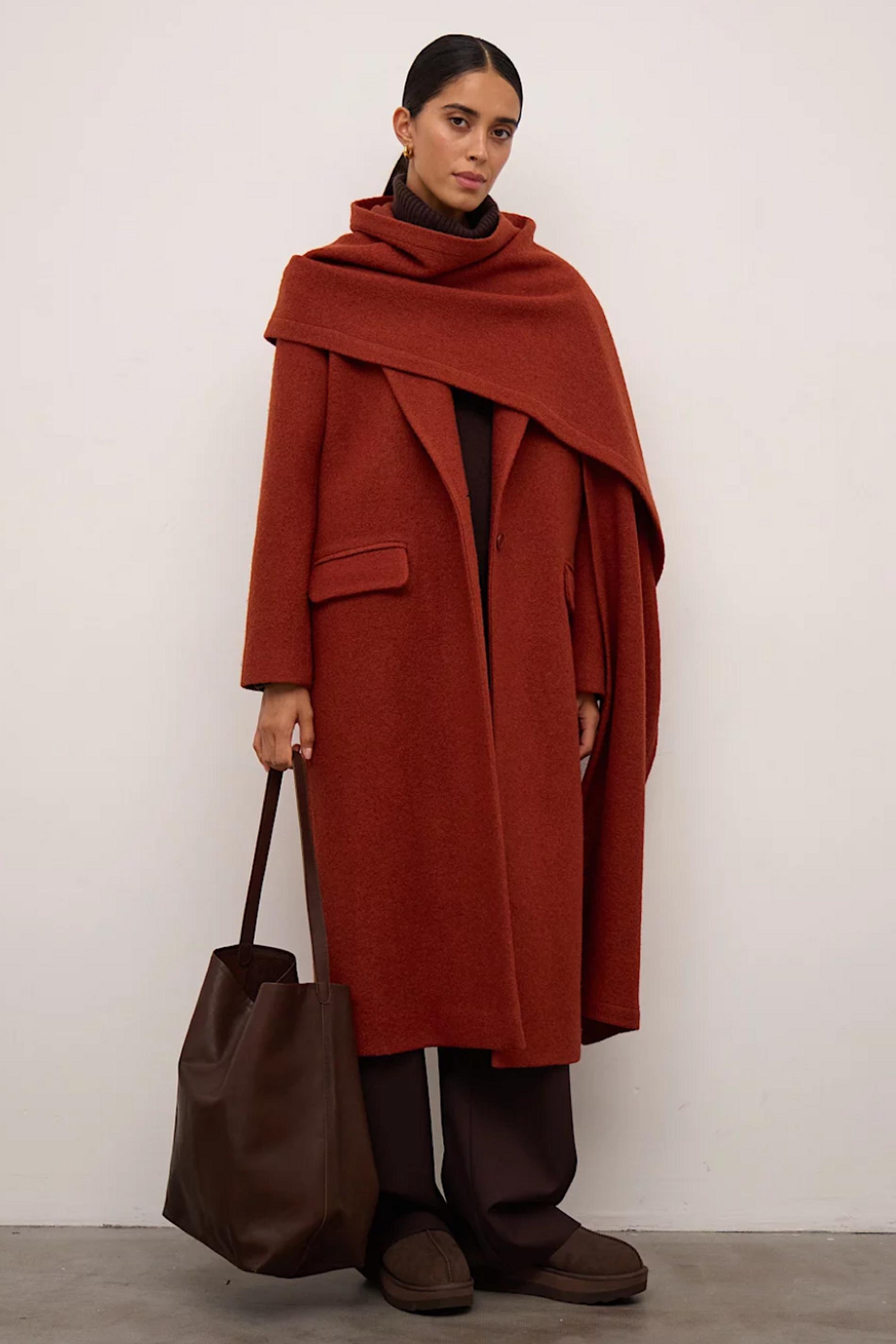 Широкий (и ни в коем случае не узкий) шарф или палантин образует с пальто одно целое. Такой дуэт избавит от необходимости подбирать шейный аксессуар под верхнюю одежду и ломать голову над тем, случился ли здесь match. Дизайнеры решили все за вас, а вам остается только радоваться уюту такого комплекта.