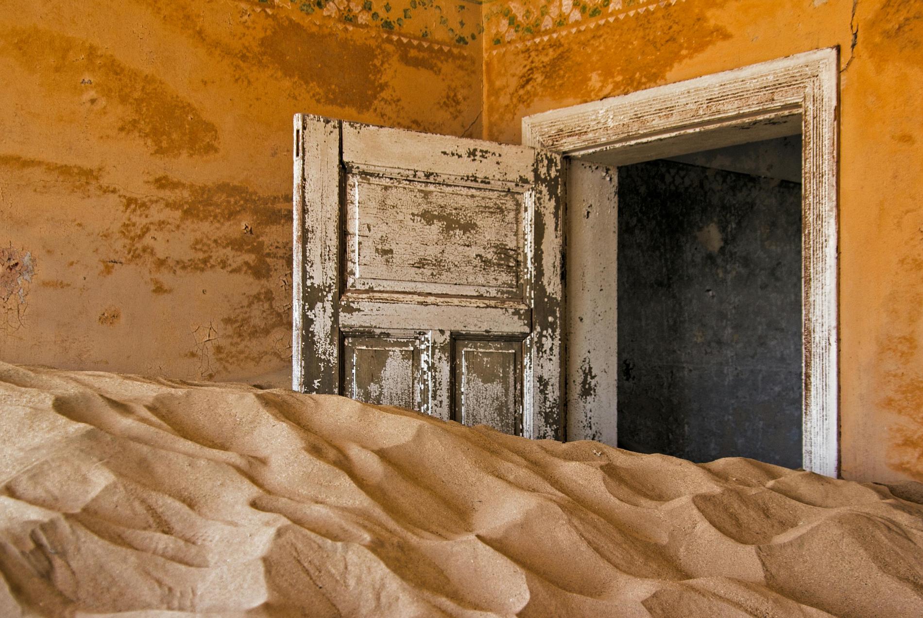 Заброшенные домики, построенные немецкими колонистами в начале XX века, утопают в песках. Менее 100 лет назад Колманскоп был одним из самых процветающих городов мира благодаря алмазам, которые здесь нашли. Но при наличии собственной пивоварни, фабрики мороженого, театра в городе не было главного — источника воды. Алмазов не стало, и Колманскоп был покинут. Теперь его поглощает пустыня, а туристы делают «мистические» кадры в «залитых» песком комнатах с облупившимися стенами.
