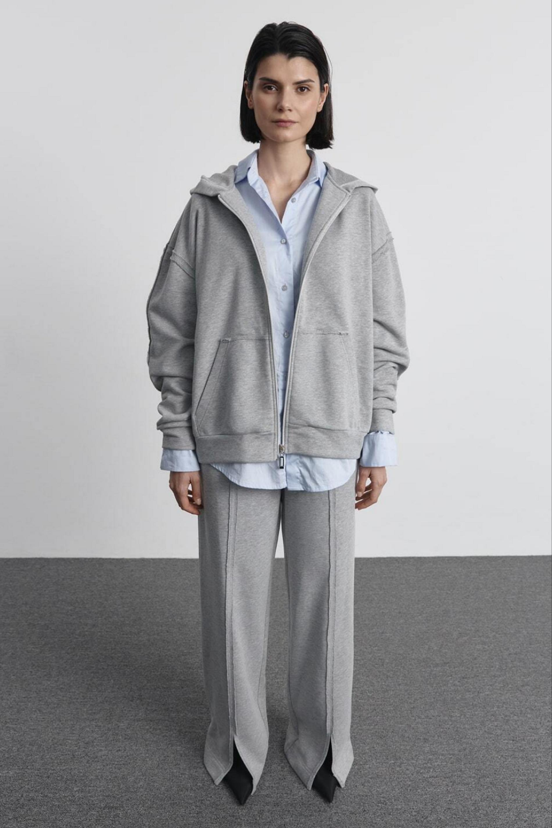 Ну и несколько слов про стилизацию: многослойность спортивные костюмы любят, факт. Футболки и майки — привычный нижний слой. А как насчет строгих и не очень рубашек? Надевайте их под толстовку так, чтобы воротник, манжеты и нижние края рубашки выглядывали из-под кофты. И еще любопытный вариант: лонгслив, тонкий классический кардиган и сверху зипка. Та же ситуация с обувью: не кроссовками и кедами едиными — казаки, остроносые ботильоны и даже туфли-слингбэки теперь дружат со спортом.
