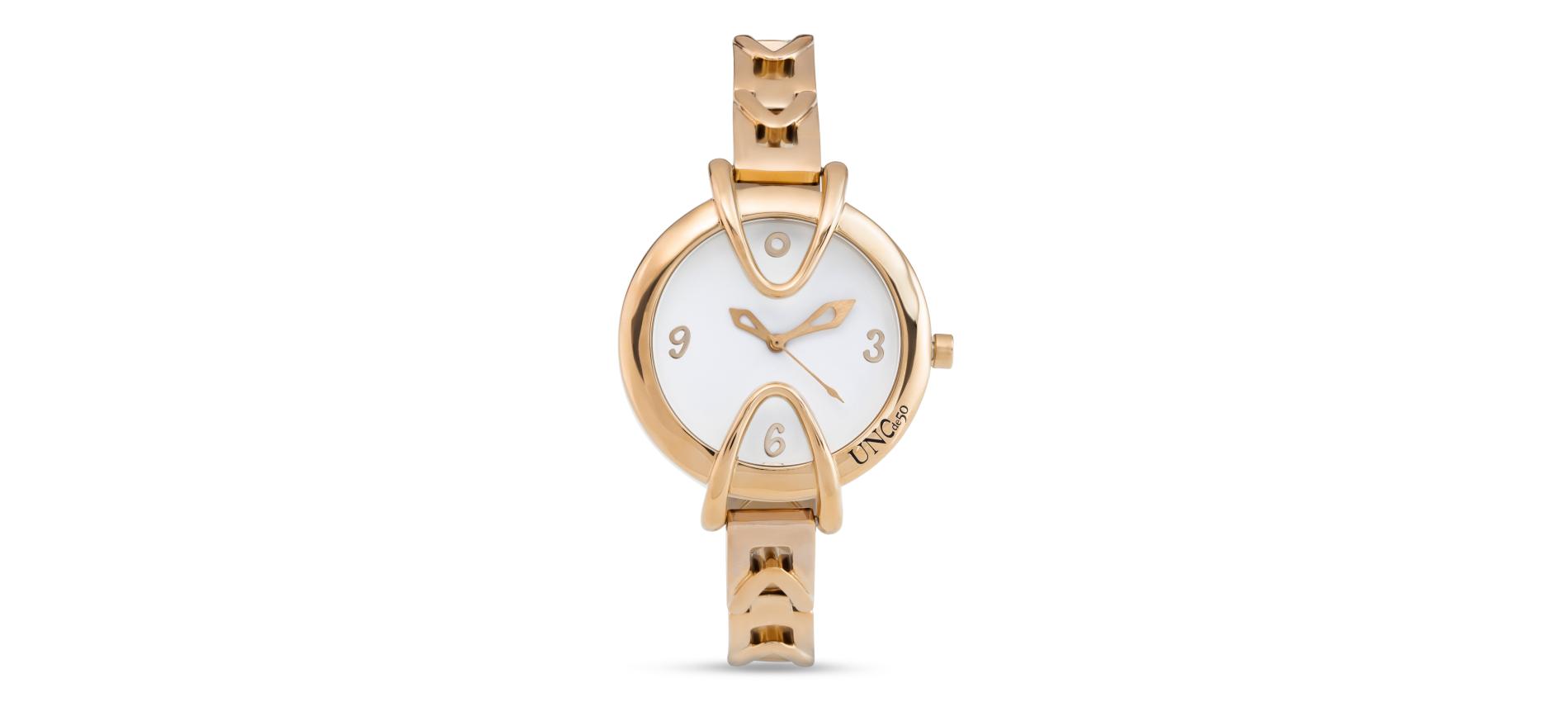 Дизайнеры не перестают экспериментировать с плетениями на браслетах. Круглые и овальные, мелкие и крупные — воображение не знает границ. Как результат — фантазийные звенья в виде элегантных канцелярских скрепок. Продолжают тему согнутых уголком элементов «ушки», держащие циферблат с кварцевым механизмом.