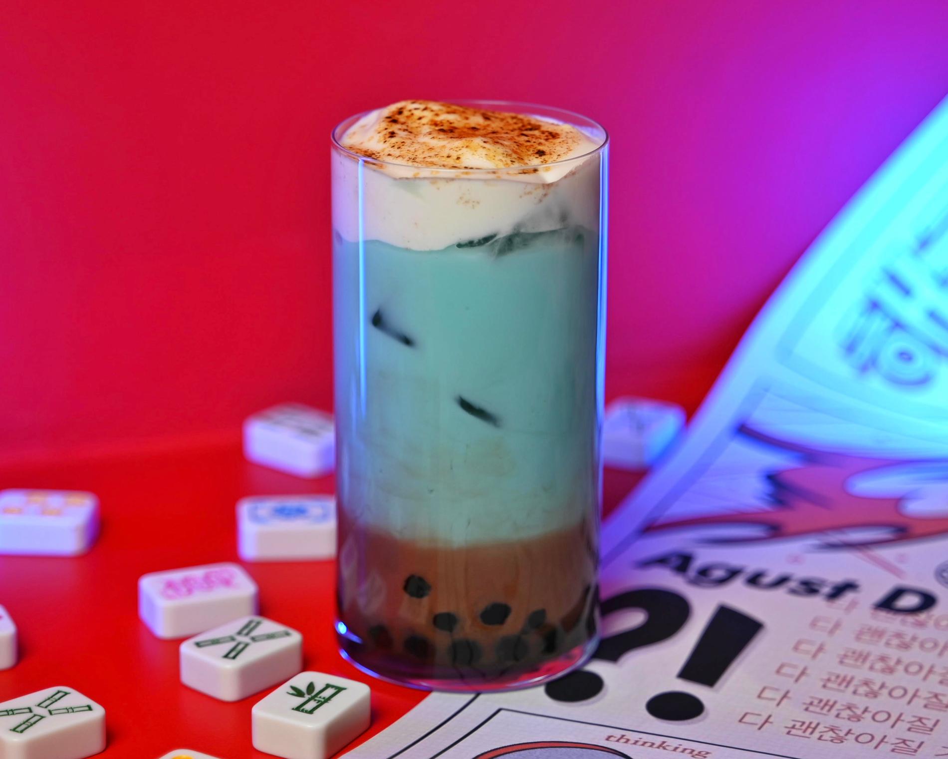 Голубое молоко, сырная пенка, шоколадный сироп, шарики из тапиоки — любопытные ингредиенты для какао, тем более для сырного. В отличие от традиционных теплых напитков этот — в холодном виде — напоминает не о зиме, а о лете. Скучаем.