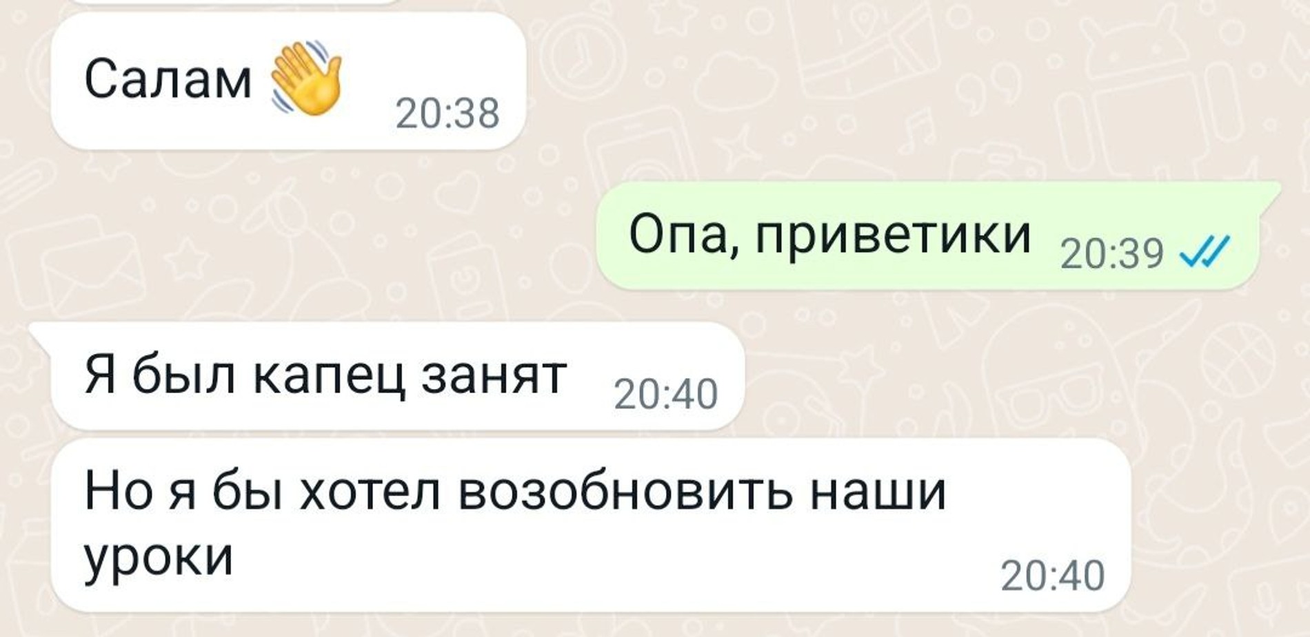 В WhatsApp Ник просил меня писать ему на русском: так будет больше практики. Первое время он, видимо, стеснялся и писал мне сообщения на своем родном языке.