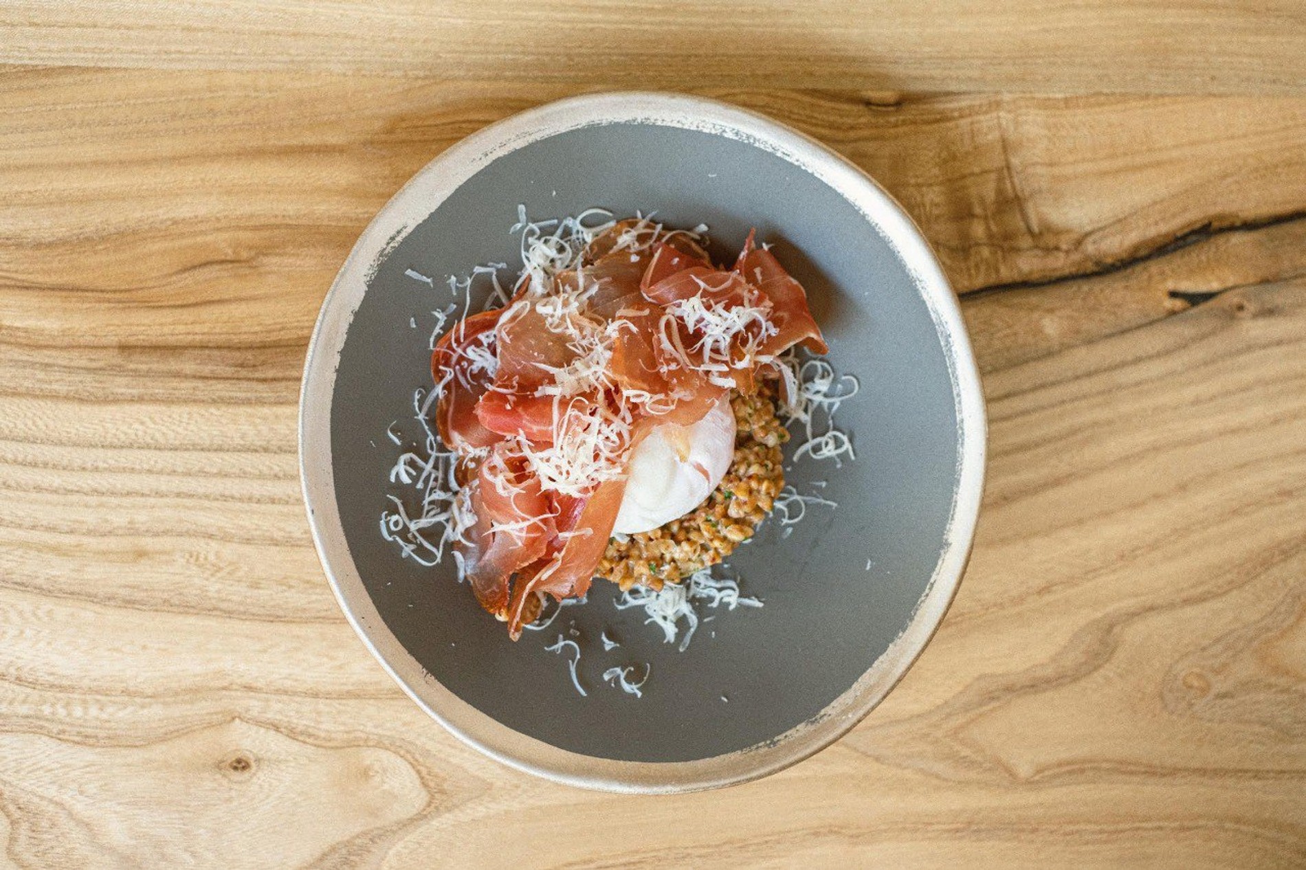 Выложите гречетто на тарелку, сделайте углубление для яйца и положите его туда. Сверху добавьте прошутто, пармезан и украсьте зеленью.