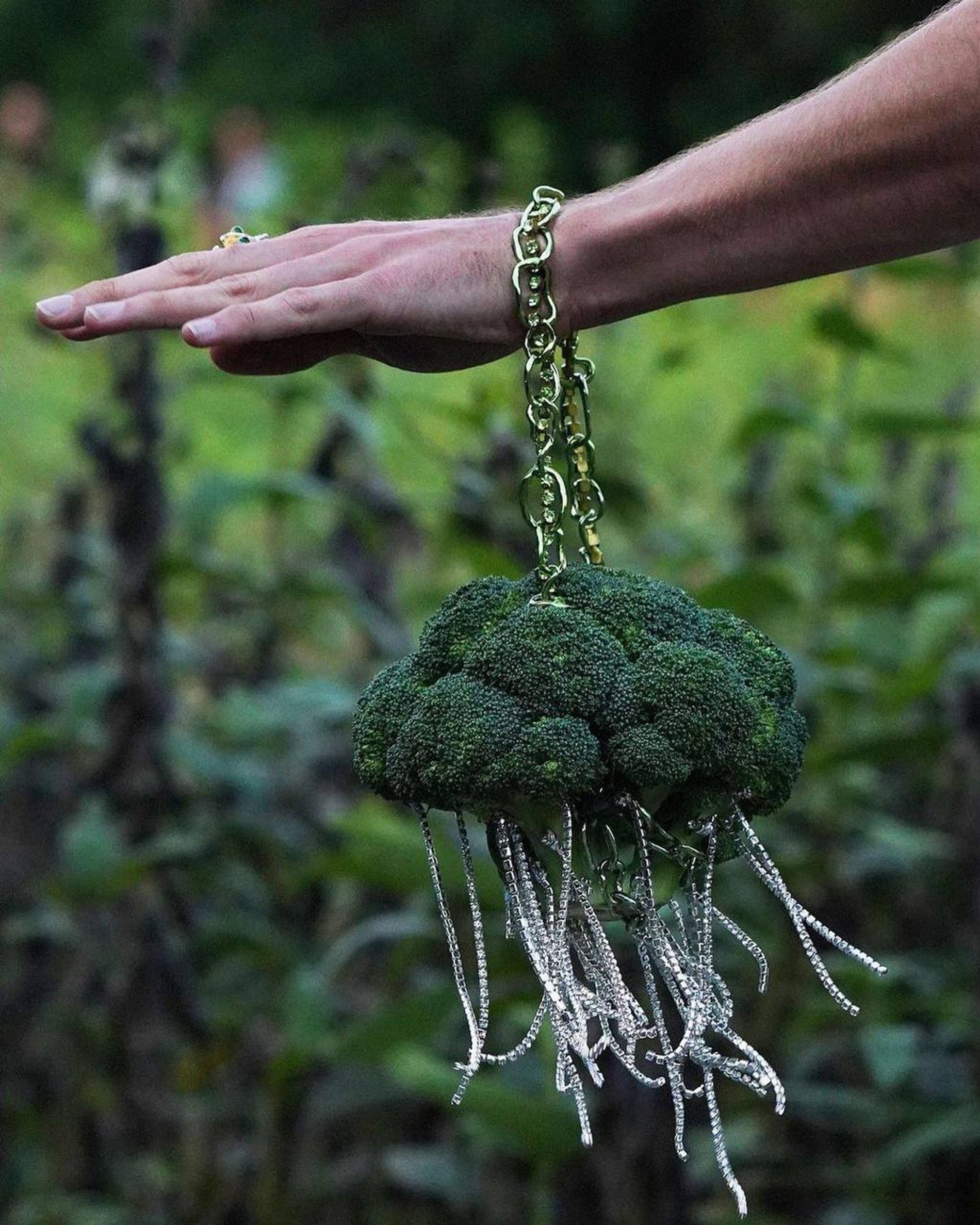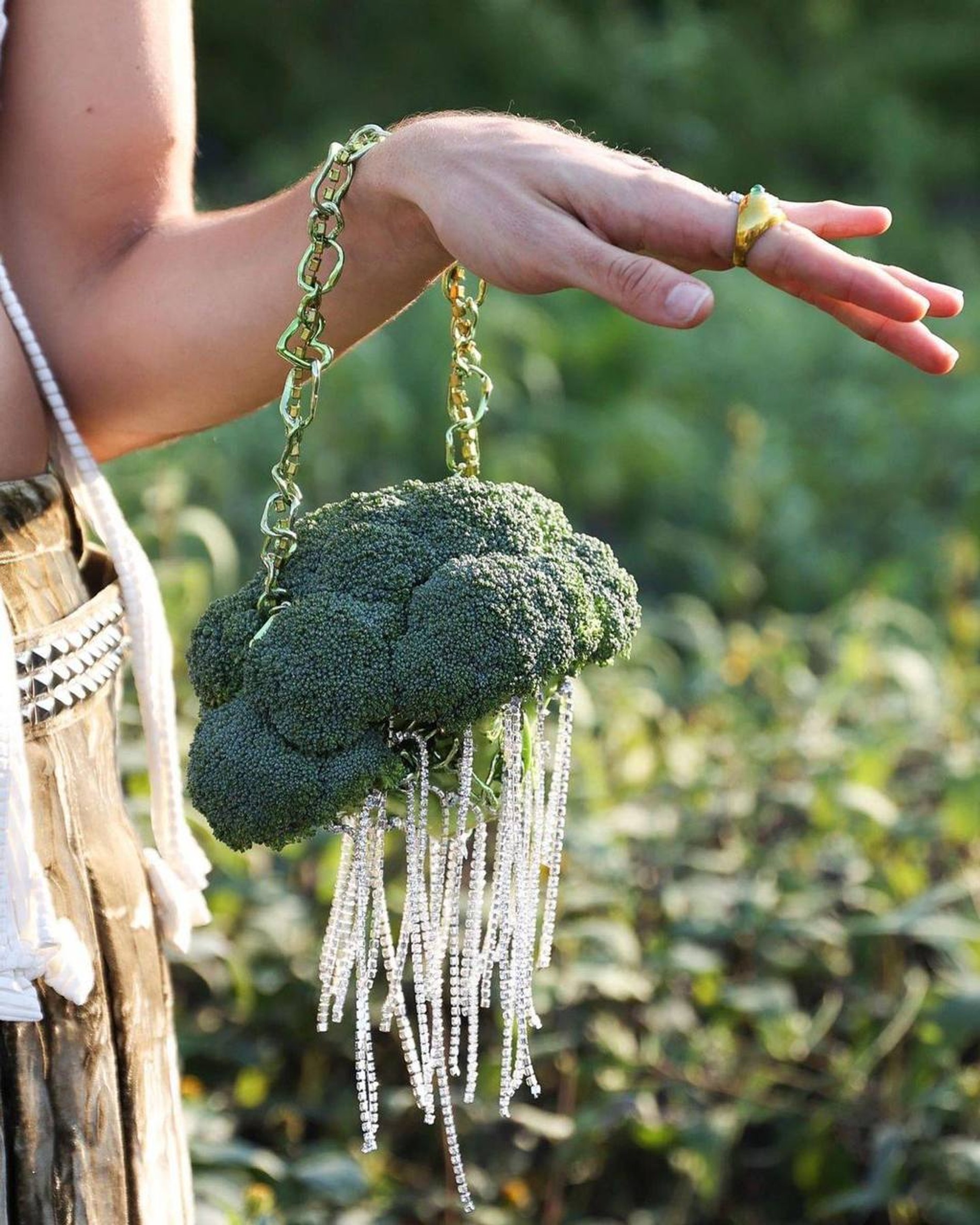 Сумка-голова, голубь, мусорный пакет и даже сумка-трусы — все это и многое другое в том же духе уже было. А вот сумка в виде капусты брокколи с кристаллами Swarowski, которая была продемонстрирована на Неделе моды в Нью-Йорке, — это что-то новенькое. Ее придумала дизайнер и основательница американского бренда Сollina Strada Хиллари Теймур. Зачем? «Я просто делаю сумасшедшие вещи, — откровенно признается Хиллари, которая на самом деле ориентируется на эко-повестку и развивает свой бренд в направлении устойчивой моды. — И если вам нравится такая эстетика, вы надолго сохраните эту вещь».