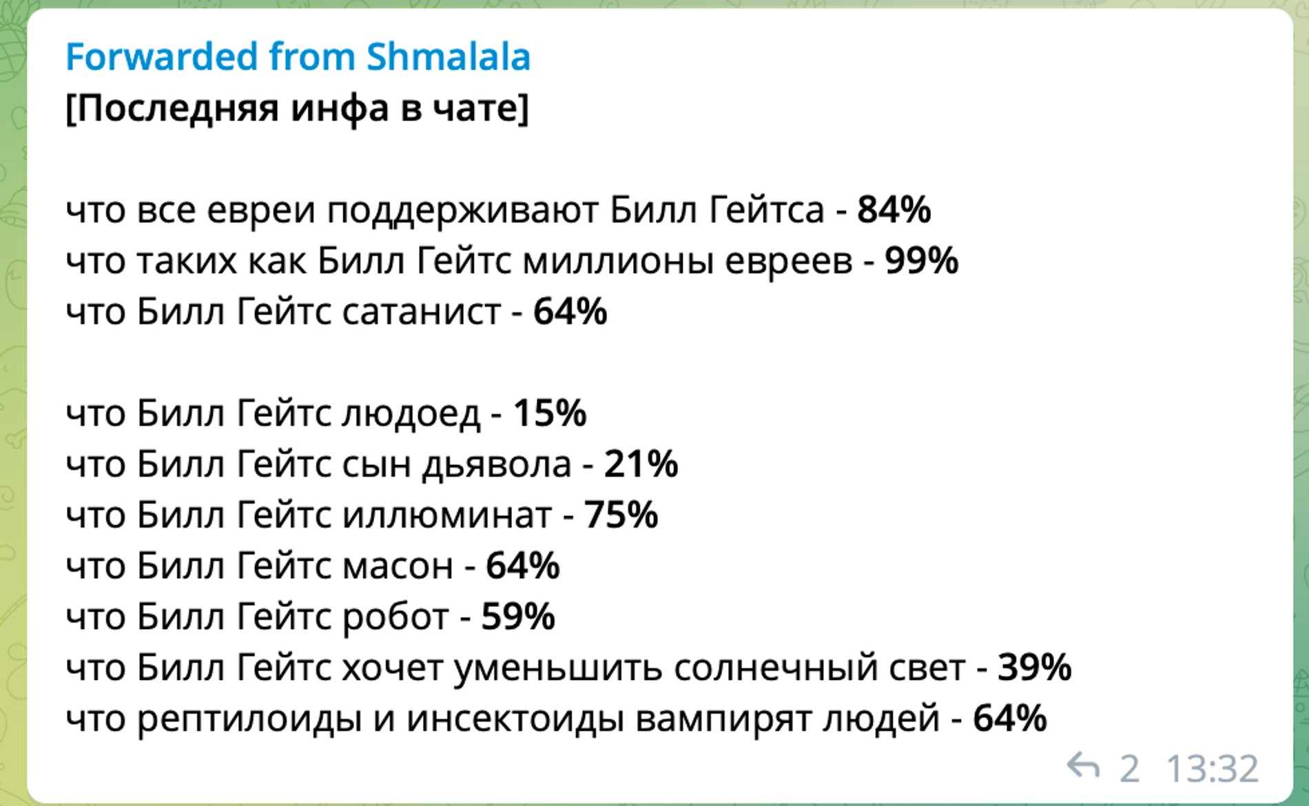 В открытом тг-чате ЕВРЕИ — ЛЮДОЕДЫ царит чинная атмосфера светского салона. Эмансипированные джентльмены обмениваются репликами о новом мировом порядке, адренохроме и иудофашистских оккупантах. За окном идет дождь.