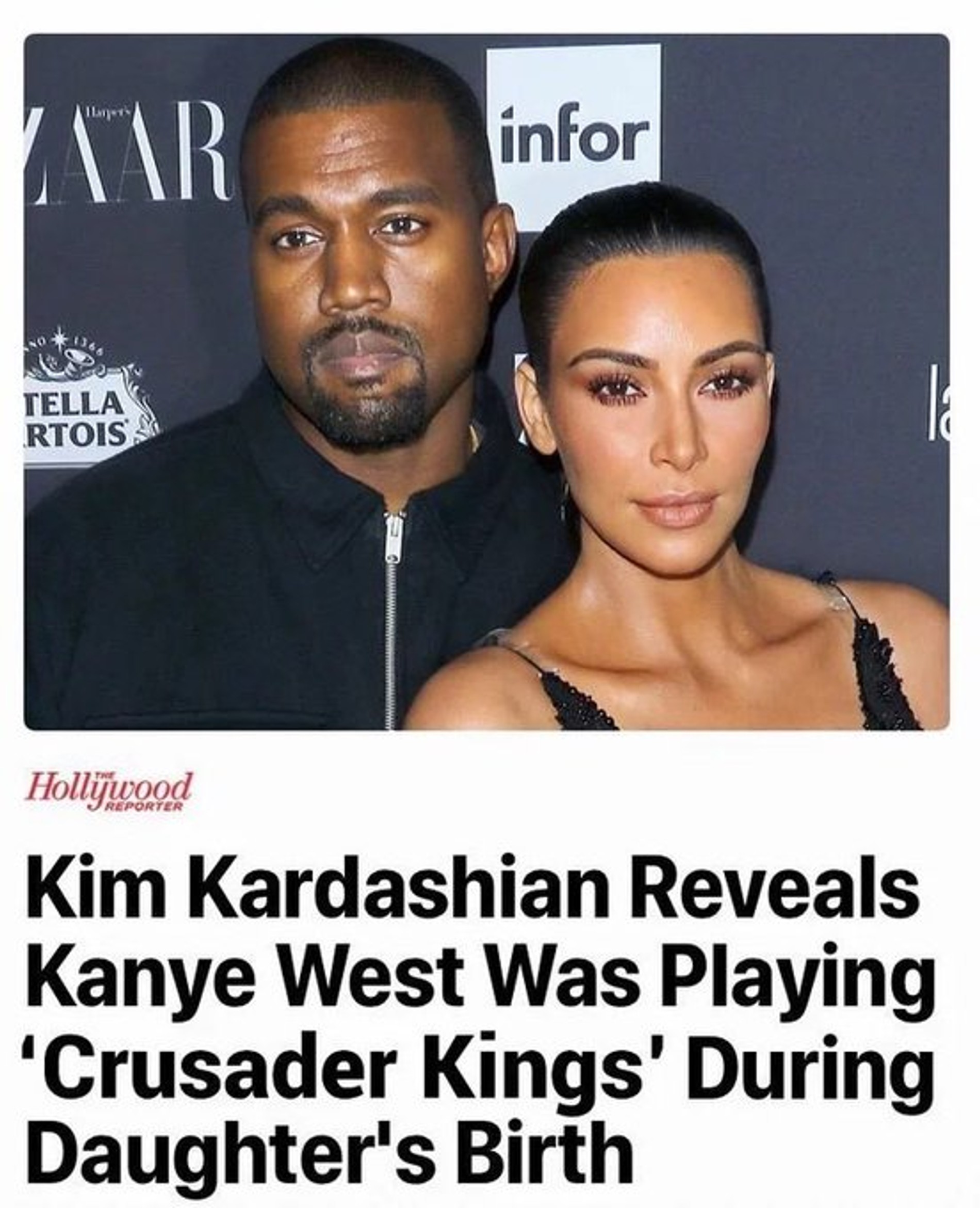 Параллельно Канье не смог молчать и решил внести свои правки в семейную легенду. Выяснилось, что все не так просто не только с зачатием, но и с рождением Норт. По признанию рэпера, в сакральный момент появления дочери на свет отец вовсю резался в компьютерную стратегию Crusader Kings.